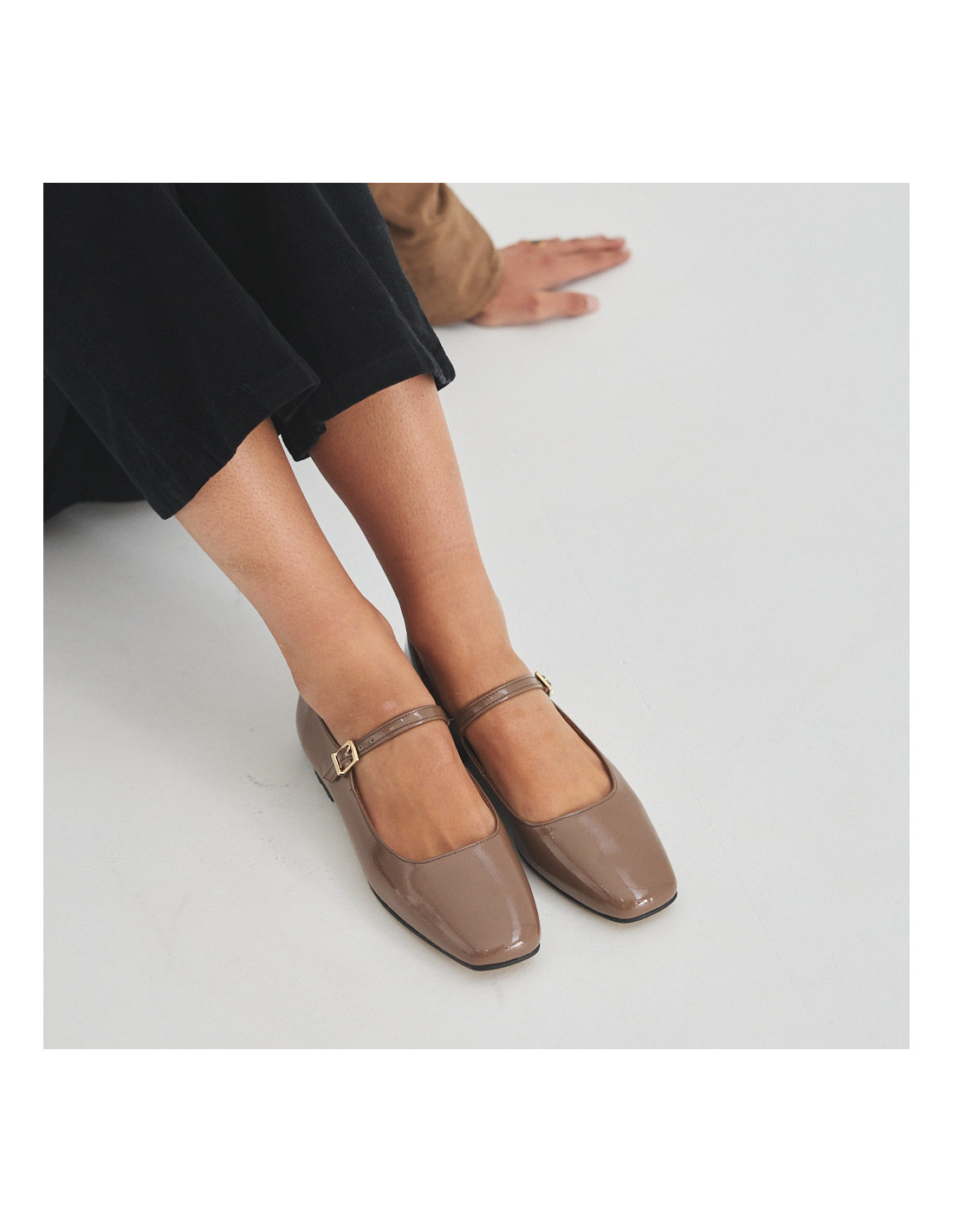 Mary Jane mit Riemen Carlota in Zimt-Lackleder, Frontalansicht, Gesamtansicht des Modells, das auf dem Boden sitzt - MONPIEL