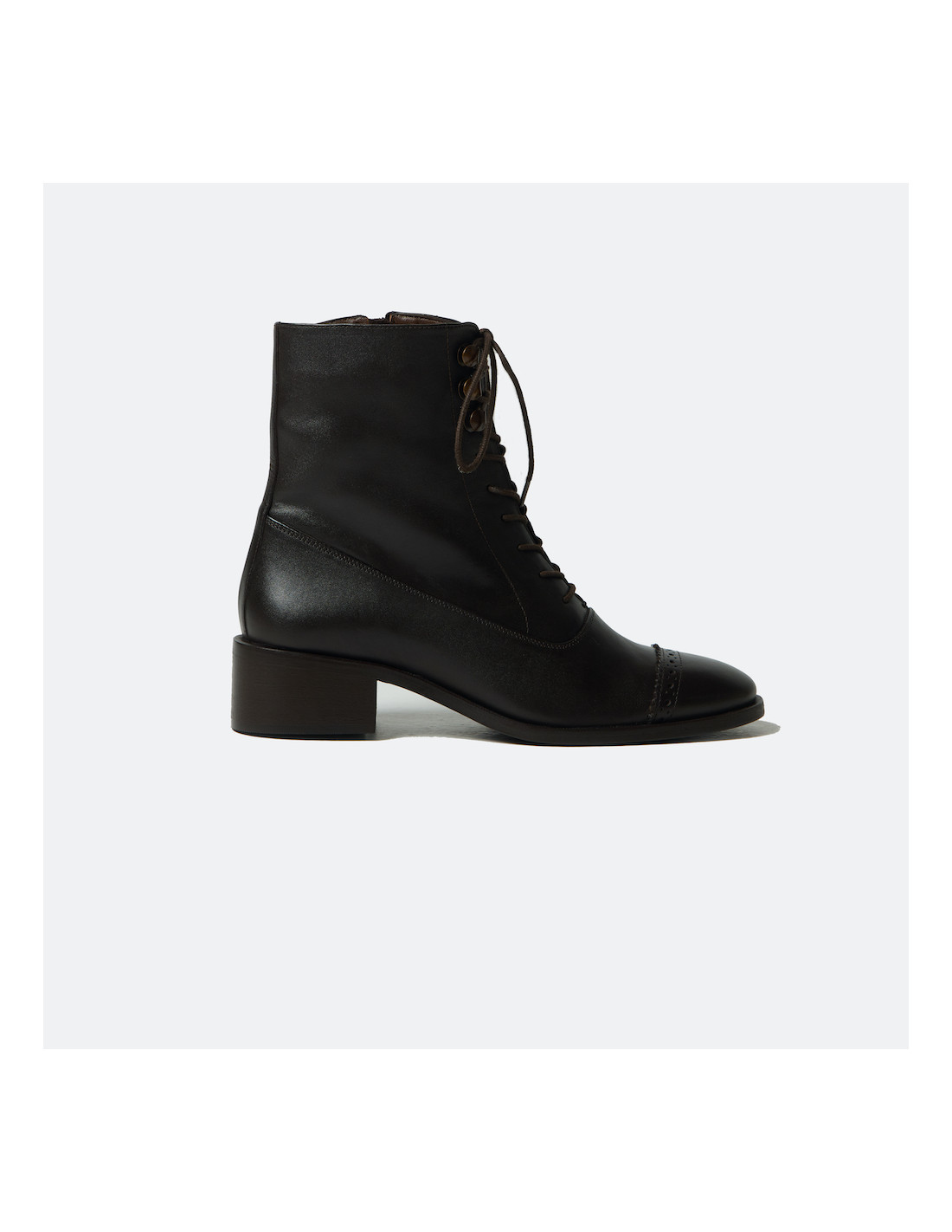 Ein Damen-Lederstiefelette mit klassischem Design und besonderen Details. Die sichtbaren Nähte, insbesondere die Ziernaht an der leicht abgerundeten Spitze, sowie die goldfarbenen Verzierungen am oberen Rand machen diesen Schuh absolut einzigartig — perfekt für den Winter.