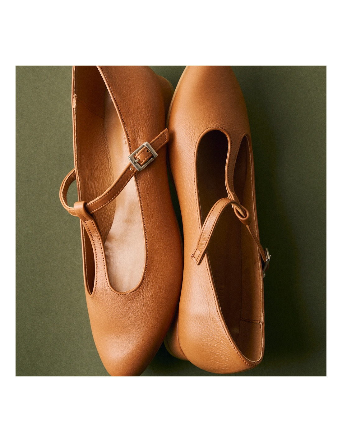 Damen-Mary Janes Marieta aus Leder in Cognac, mit auf einem Hocker ruhendem Fuß, Halbnahaufnahme - MONPIEL