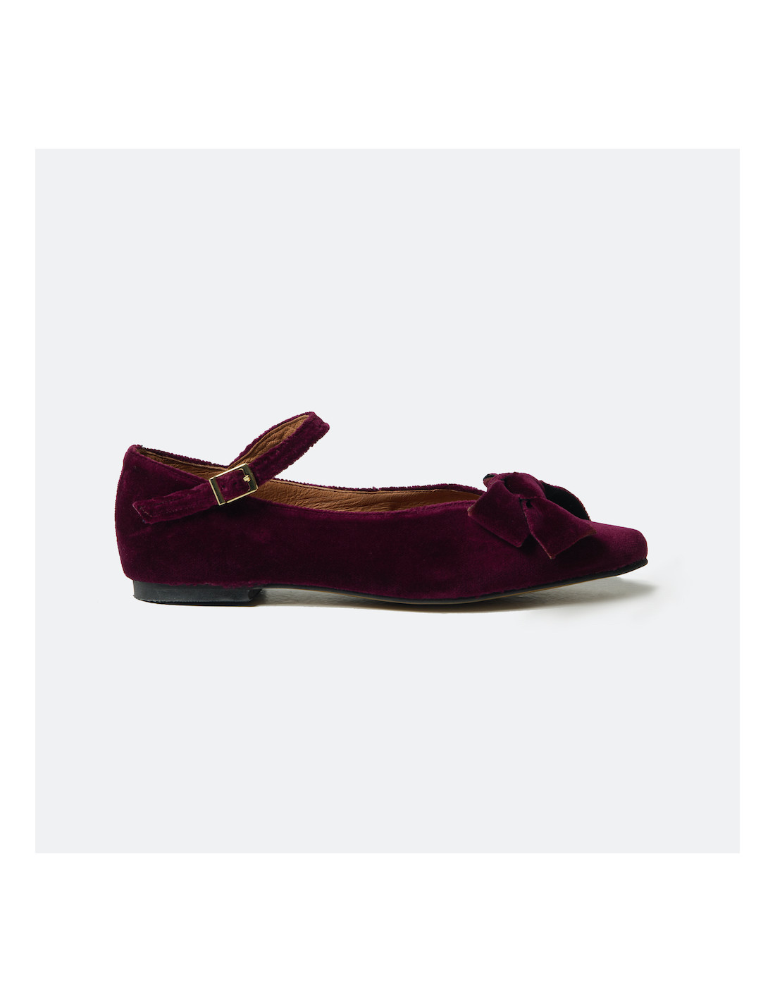 Entdecke die Mary Jane Blanca, eine Damen-Mary-Jane aus bordeauxrotem Samt, die ein wahres Schmuckstück an Eleganz und Raffinesse ist. Ihre leicht spitze Kappe und die große Samtschleife auf dem Spann verleihen einen klassischen und femininen Touch, während der Riemen, der am Knöchel gebunden wird, einen sicheren und bequemen Sitz garantiert. Ihr 1 cm hoher Blockabsatz betont die Figur, ohne den Tragekomfort zu beeinträchtigen.