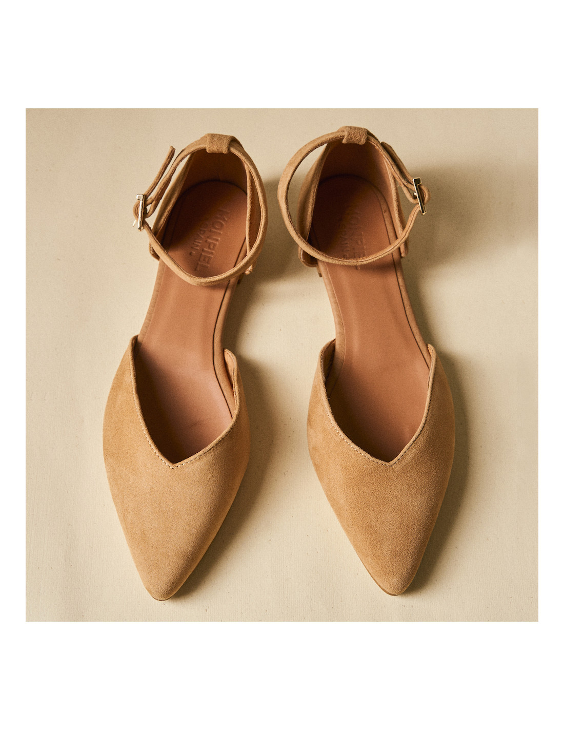 Unsere Mary Jane mit V-Ausschnitt Emma, eine flache Leder-Mary-Jane für Damen, die den Fuß dank ihres V-förmigen Ausschnitts optisch streckt und schmeichelt. Ein subtiles Detail, das für Eleganz sorgt und die Linie des Spanns visuell verlängert. Gefertigt aus echtem Leder und mit Knöchelriemen mit Schnalle, bieten sie einen bequemen und sicheren Halt – perfekt für den Alltag. Erhältlich in Beige sowie in Farbe Tan aus Veloursleder, zwei vielseitige und zeitlose Töne, die sich leicht mit Kleidern, Röcken oder Hosen kombinieren lassen. Die Veloursleder-Version sorgt für ein weicheres und natürlicheres Finish, während das glatte beige Leder eine klarere und elegantere Optik bietet.