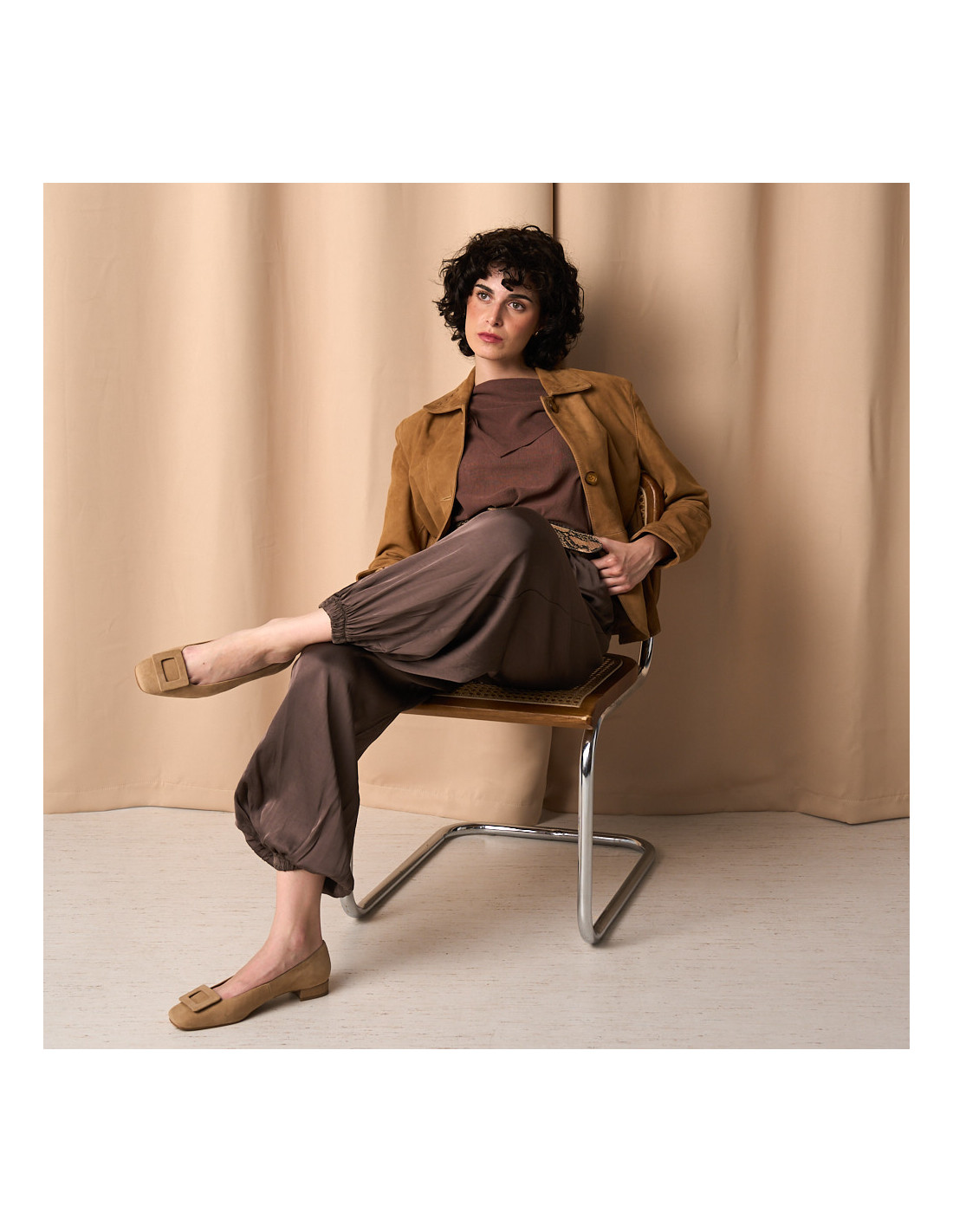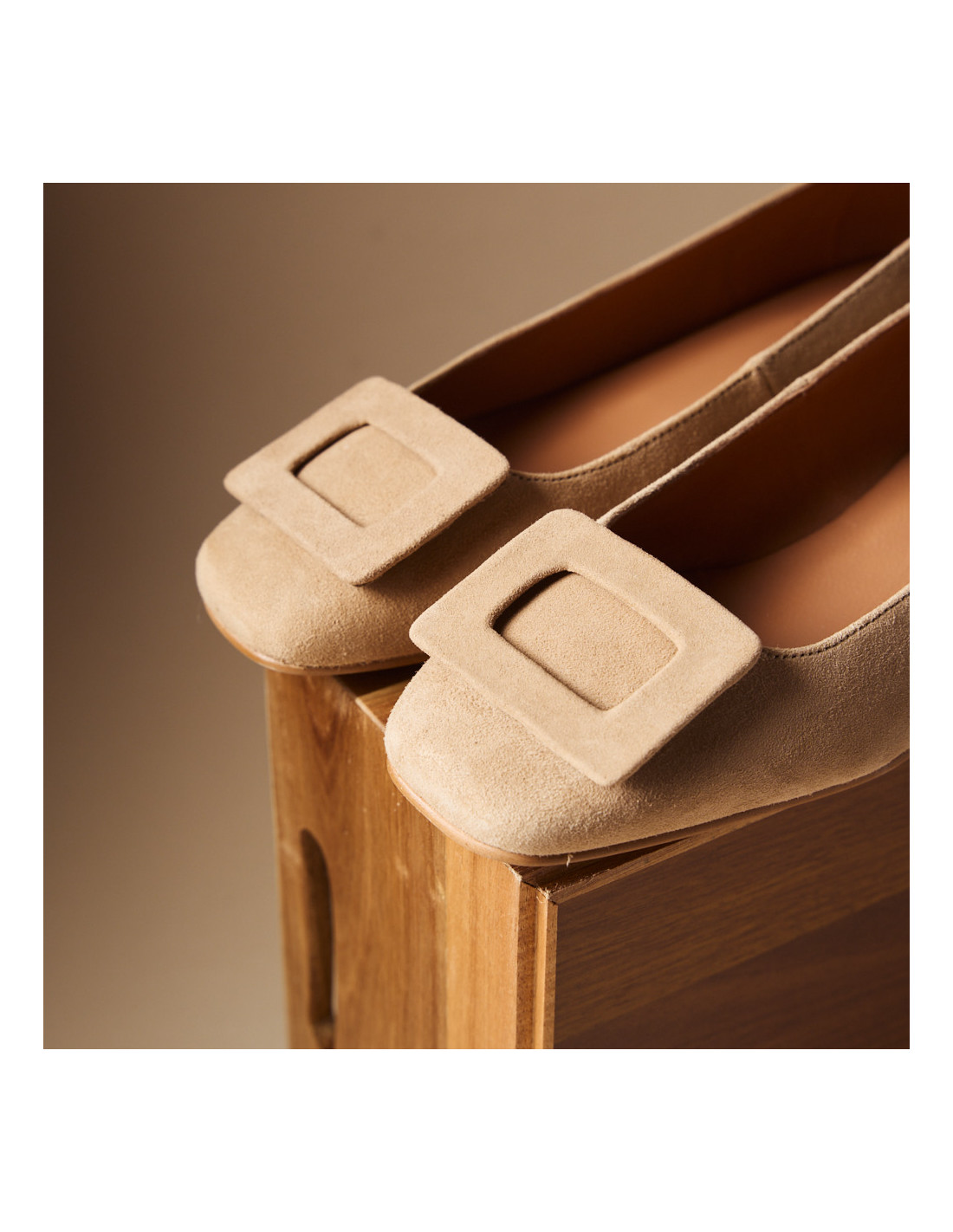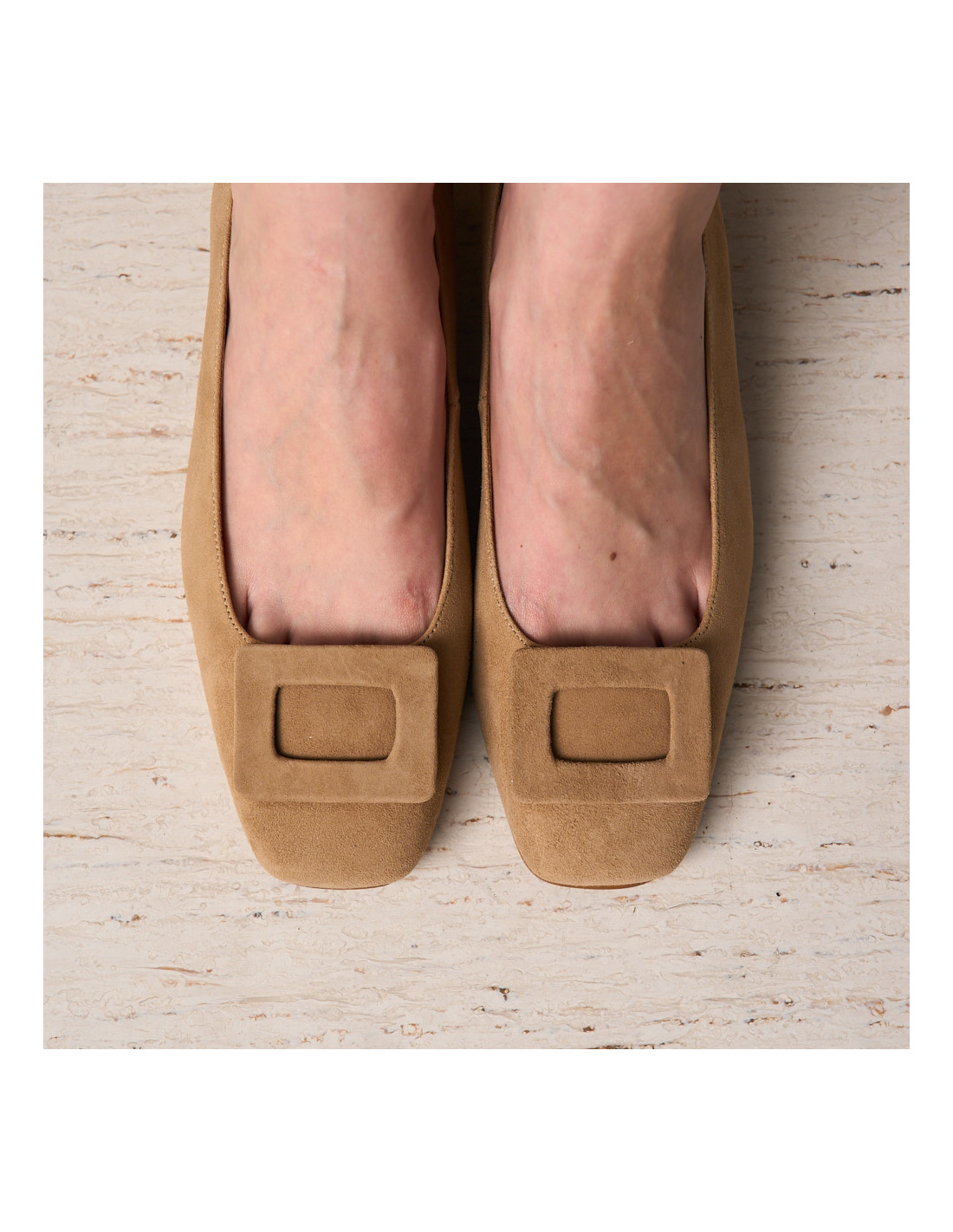 Discover our elegant Carmen ballet flat, designed with a modern square toe to offer you style and comfort in your everyday life. Crafted in beige suede leather so you can match it with countless looks, the Carmen ballet flats will be the perfect complement for any occasion. Its square toe design, block heel, and the square embellishment on the toe add a contemporary and sophisticated touch, while the construction with premium materials ensures durability and comfort. This ballet flat fits perfectly to your foot, allowing maximum freedom for your foot in the shoe.