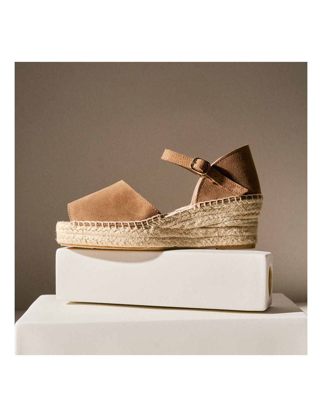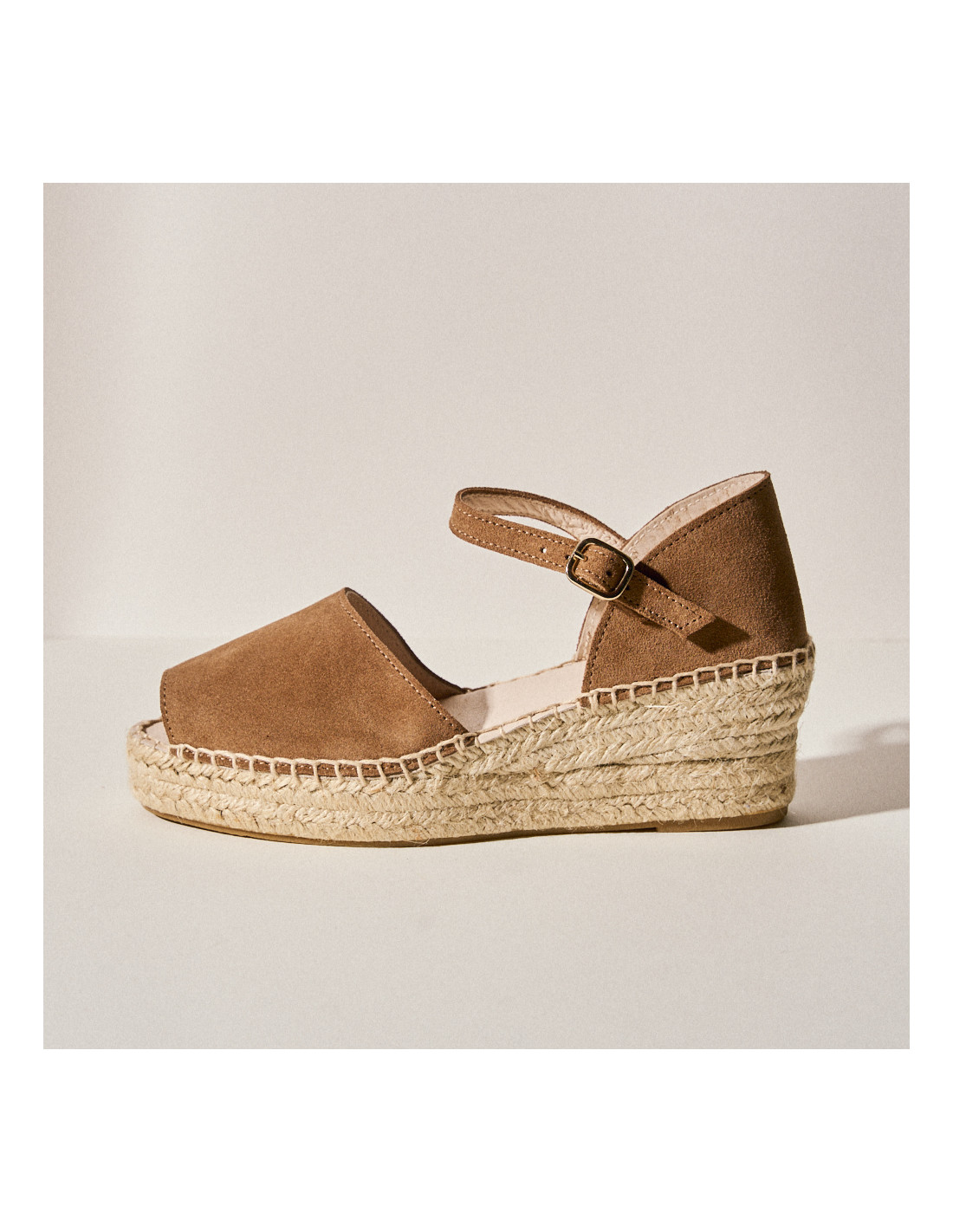 It is a mink-colored wedge espadrille with a Menorcan design, leaving the big toe slightly visible at the front. Easy to combine in this spring/summer season. A perfect basic for everyday or for special occasions. Original, with a gel insole and made of 100% natural leather. All our espadrilles are handcrafted in Spain, without mass production, and under the slow-fashion movement.