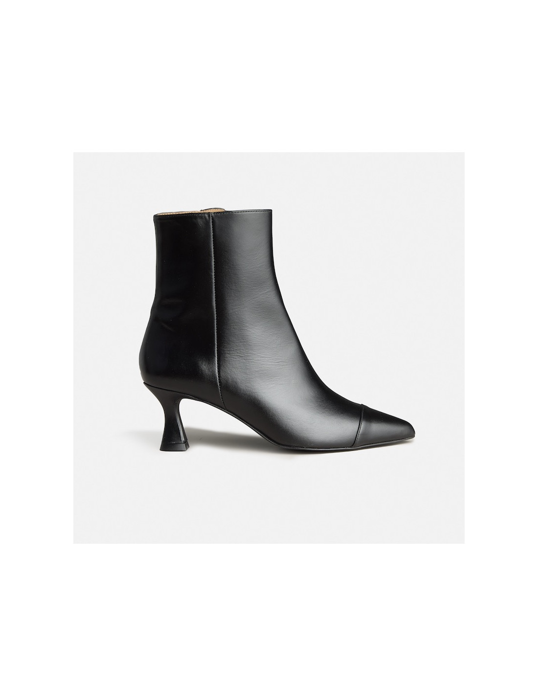 The Jimena Pointed Toe Bootie presents a refined aesthetic thanks to its sharp and fine tip. This model remains a classic elegant leather bootie but with a touch of distinction thanks to its pointed toe. Crafted in soft black nappa leather, this bootie not only enhances any look with a chic touch, but also promises lasting comfort throughout the day. Its minimalist design is complemented by a 6 cm heel, perfectly balancing comfort and fashion.