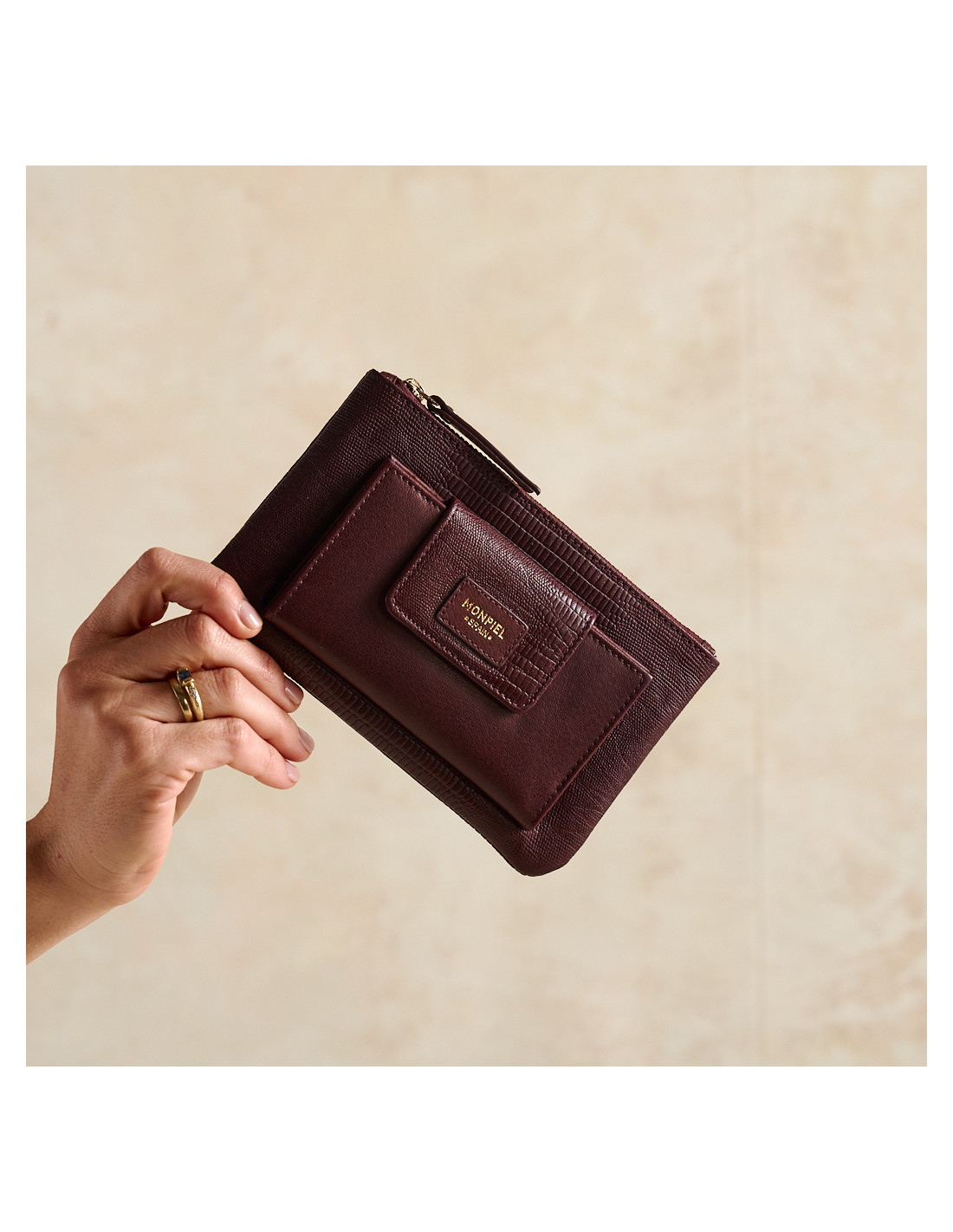 Burgundy snake-effect leather pouch-style wallet with extra pocket, front wide shot on a white background - MONPIEL