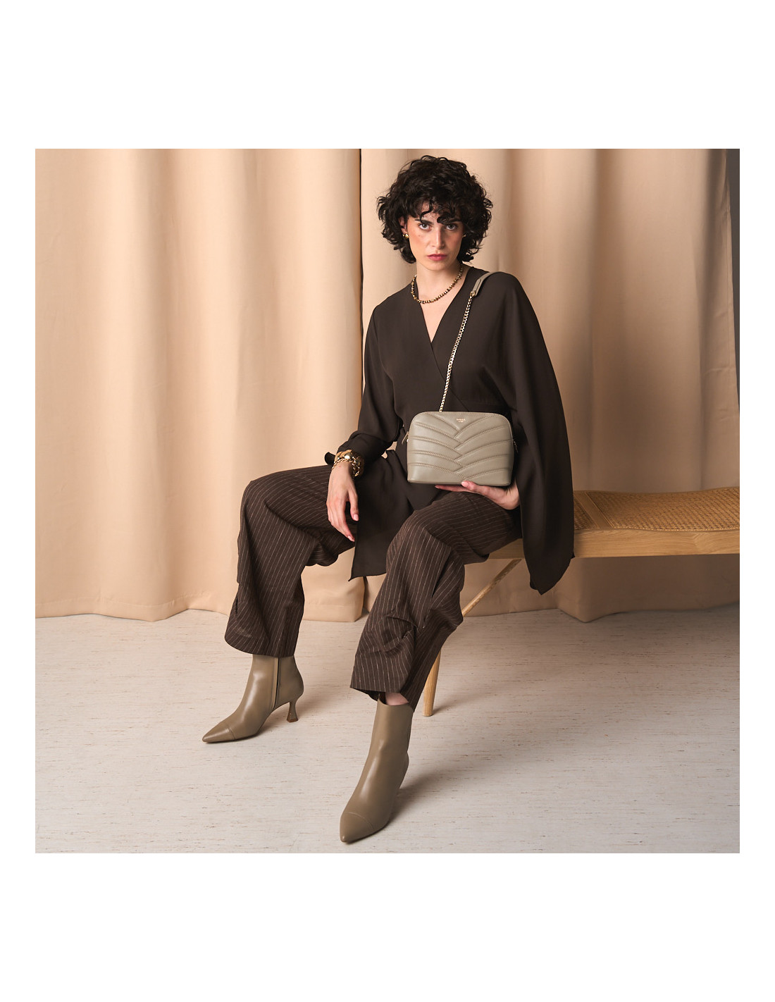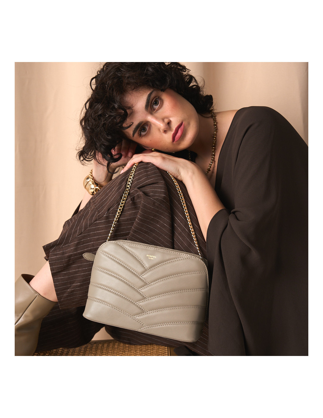 Quilted leather bag with gold chain in taupe with a beige bag in the background - MONPIEL
