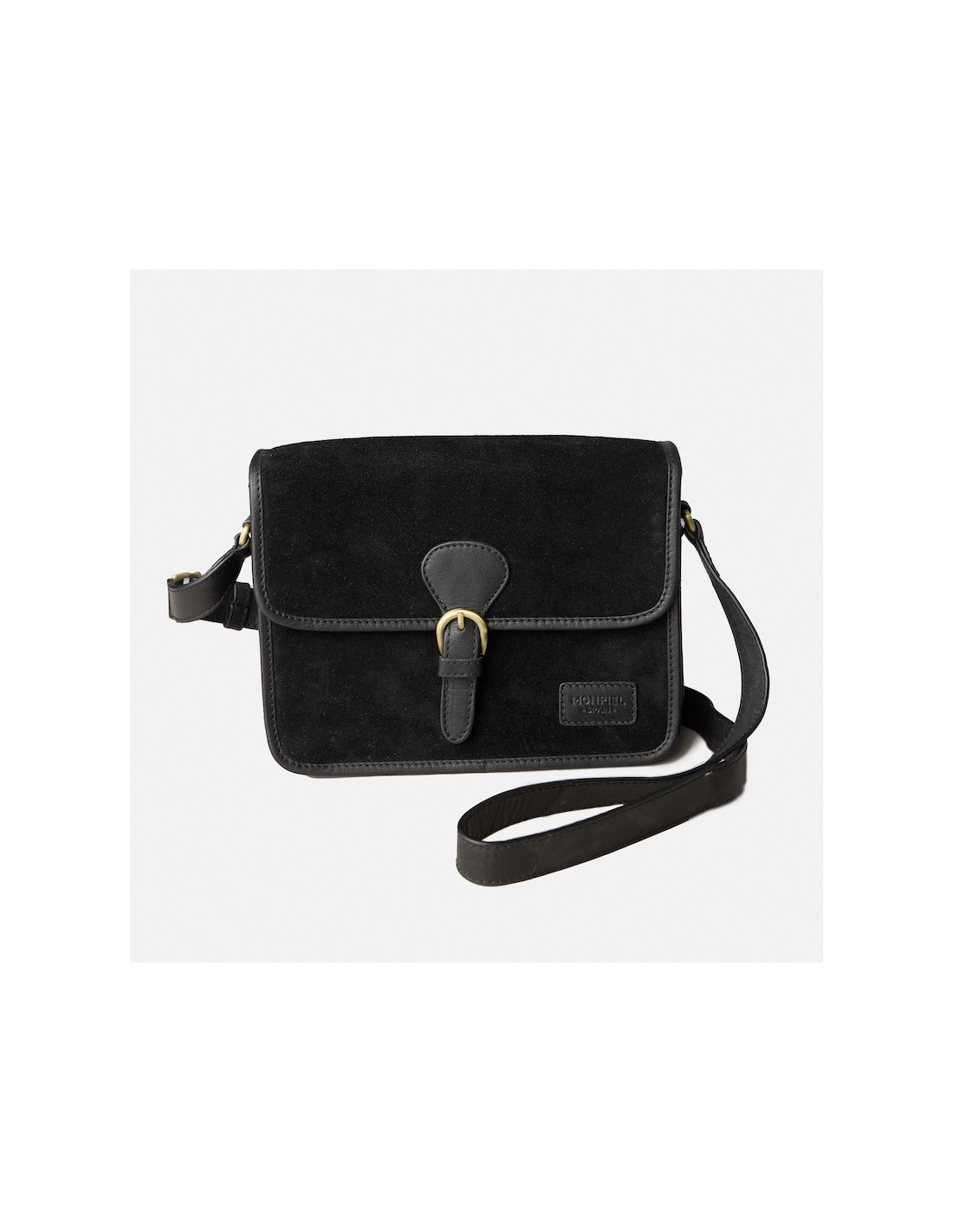 Black suede satchel bag with a buckle, front view, worn crossbody, personalized initials detail - MONPIEL