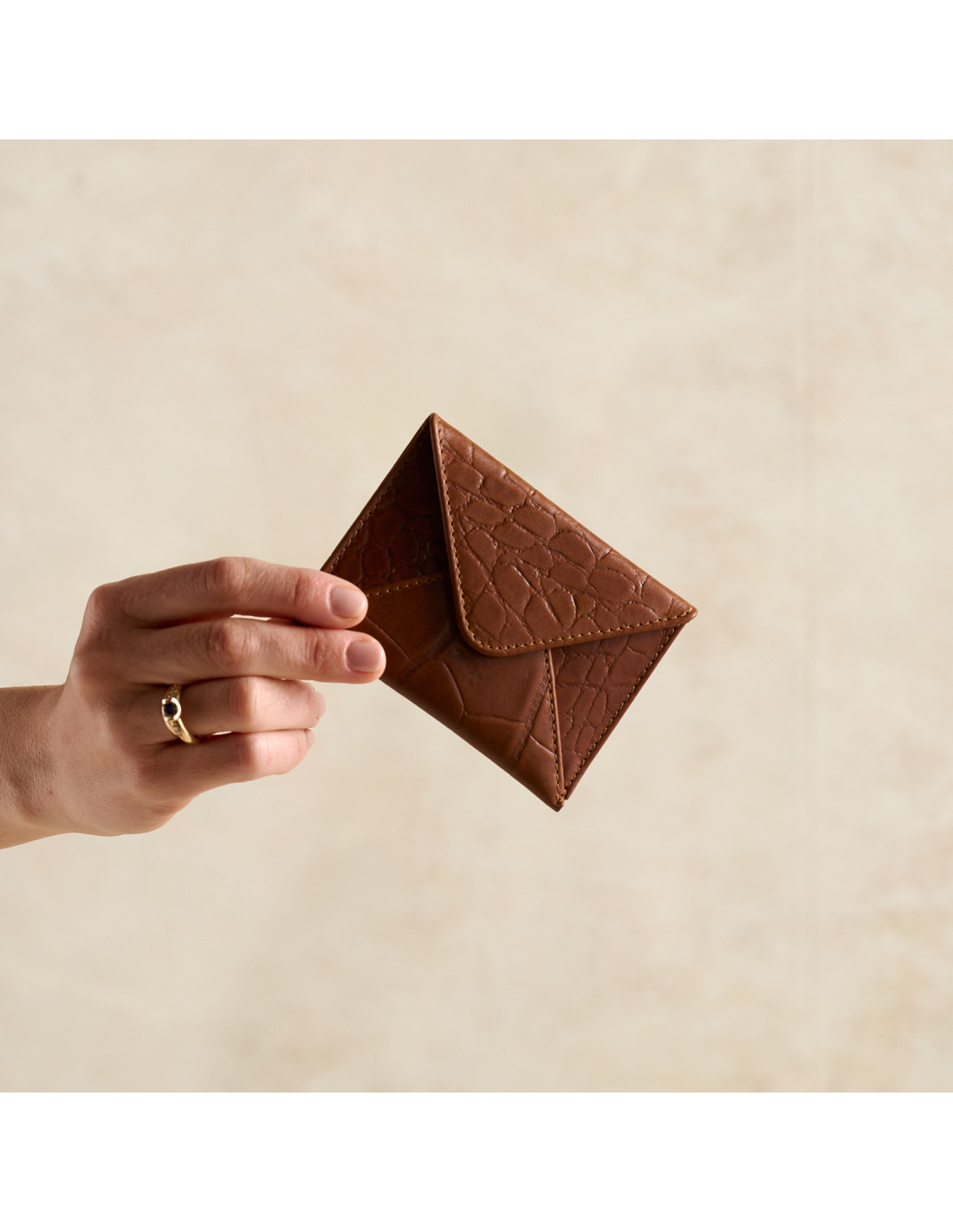 Leather envelope cardholder in leather color resting on a book and ceramic - MONPIEL