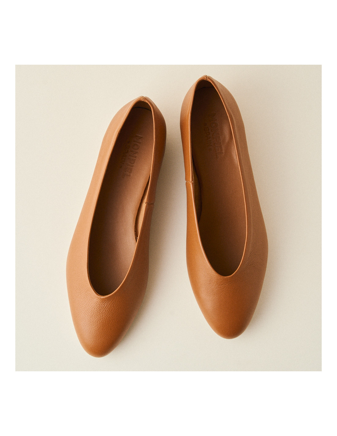 Des ballerines pour femmes en cuir 100% naturel. Nos nouvelles chaussures plates ont été créées par notre équipe de cordonniers pour que vous puissiez marcher fièrement avec un nouveau basique Monpiel. Si vous cherchez une chaussure confortable qui fuit la ballerine classique avec le nœud, c'est la vôtre! Ballerine Ameliè plate à bout fin et décolleté fermé pour styliser le pied, c'est un modèle actuel qui évoque un peu les années 90. Chaussure en cuir pour femme confortable et actuelle. Doublure intérieure et semelle en cuir pour que votre pied ne souffre pas et respire naturellement. Talon de 1,5 cm en couleur naturelle idéale pour cet été! Conçues et fabriquées entièrement à la main en Espagne. Disponible en couleur cuir, rose pâle, beige et le nouveau grenat avec la semelle noire et daim noir, quelque chose de plus spécial, si vous voulez donner à votre look une touche plus originale.