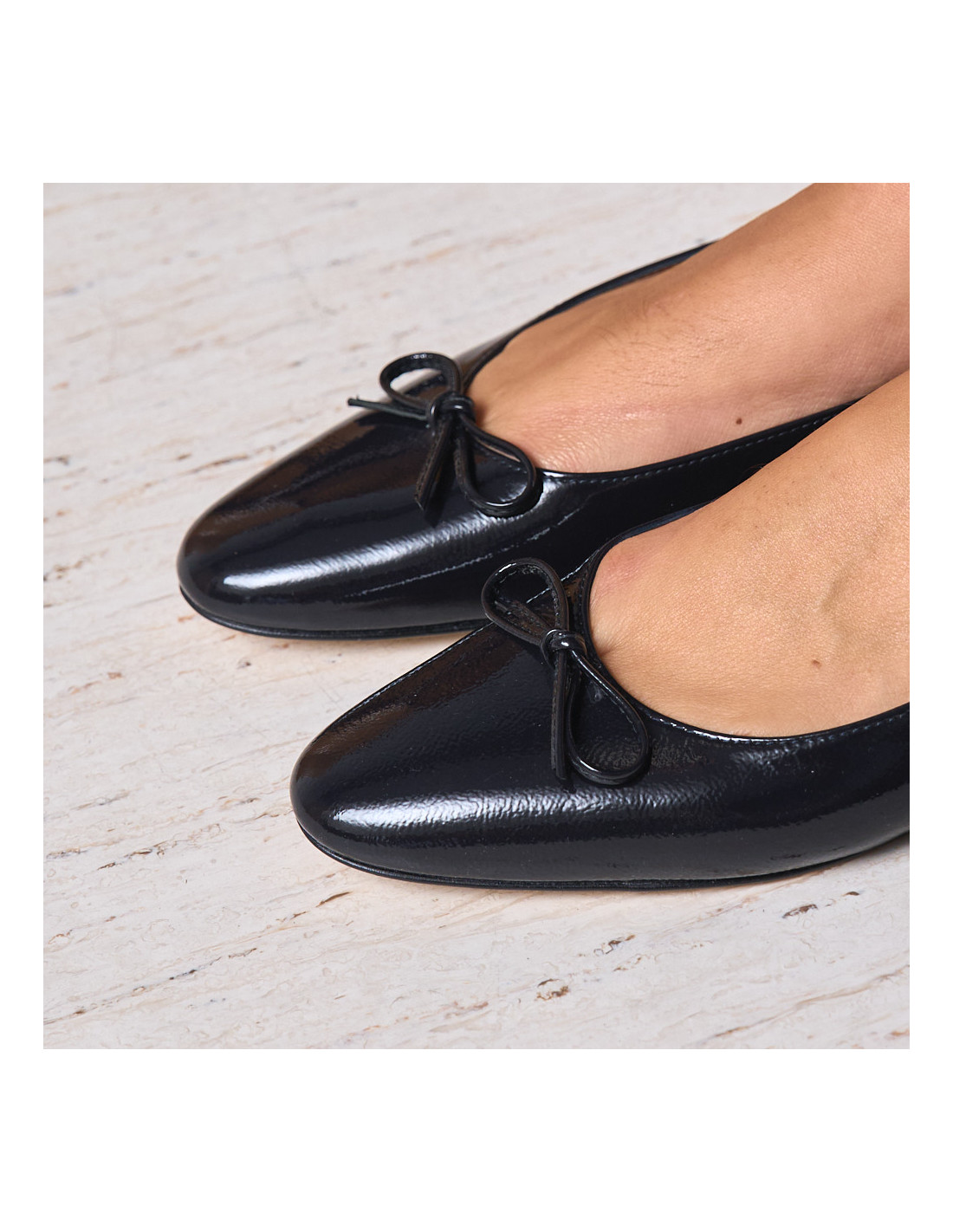 Ballerine manolita à pointe stylisée en cuir verni bleu, vue en perspective, posées sur un banc - MONPIEL