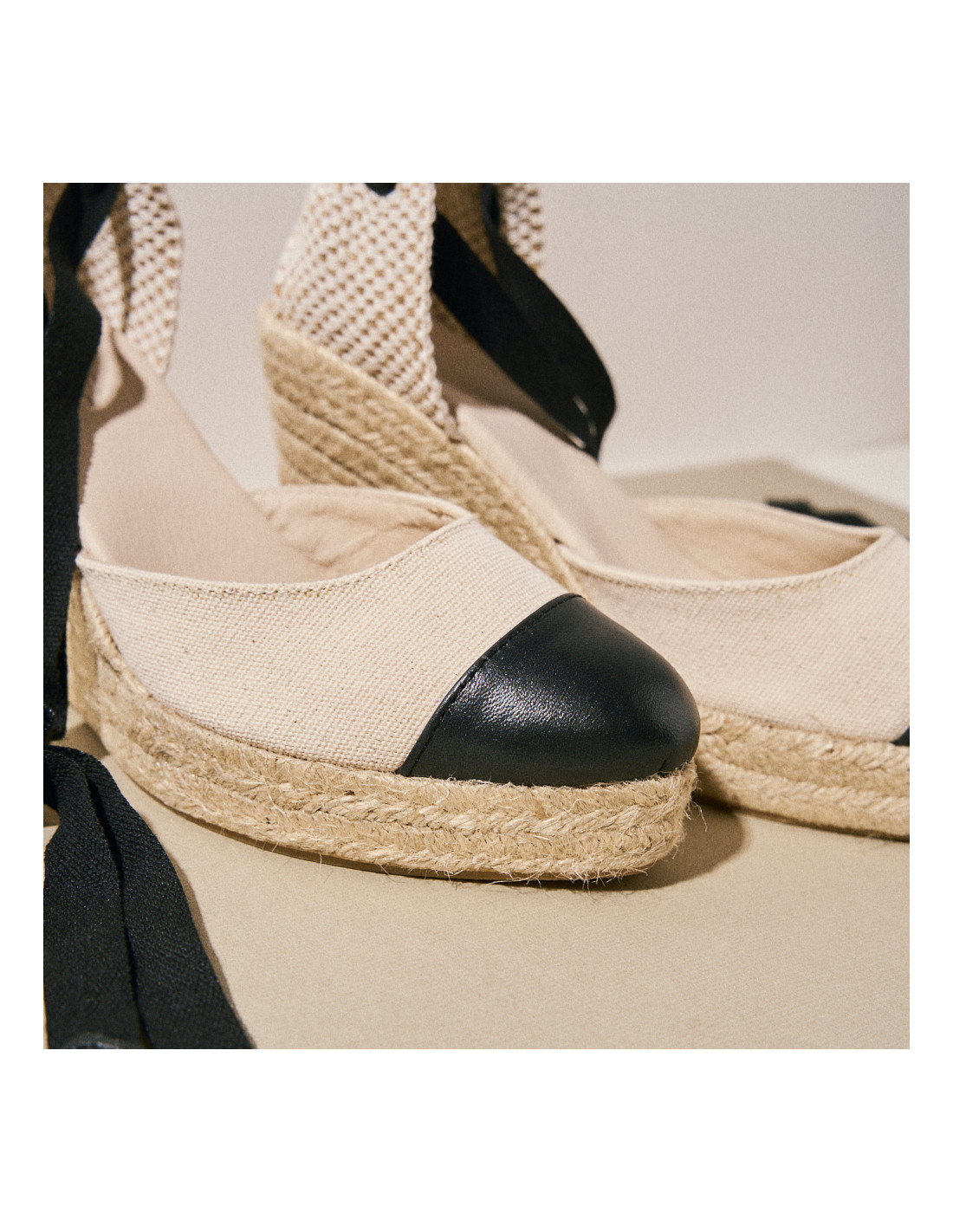 Conçues en tissu canvas avec une pointe arrondie, ce qui rend cette espadrille à talon compensé spéciale et unique est la finition de la pointe en cuir, disponible en ton métallisé et en cuir nacré noir. Sa fermeture est avec un ruban de coton de toucher doux.