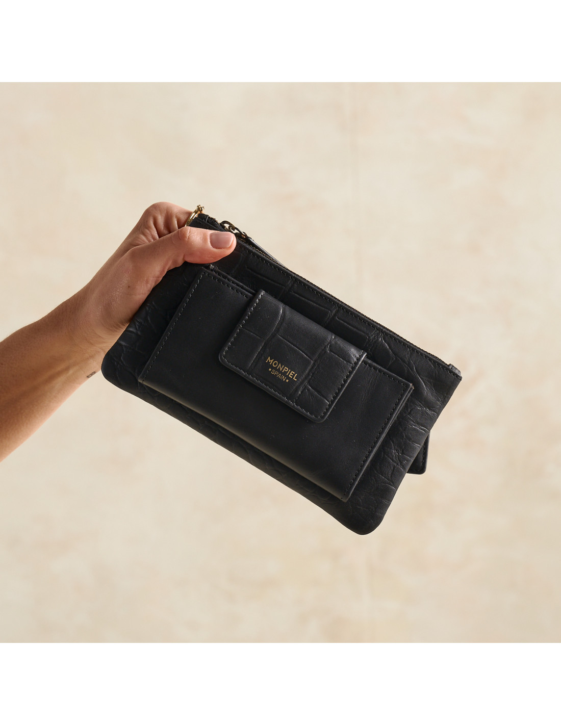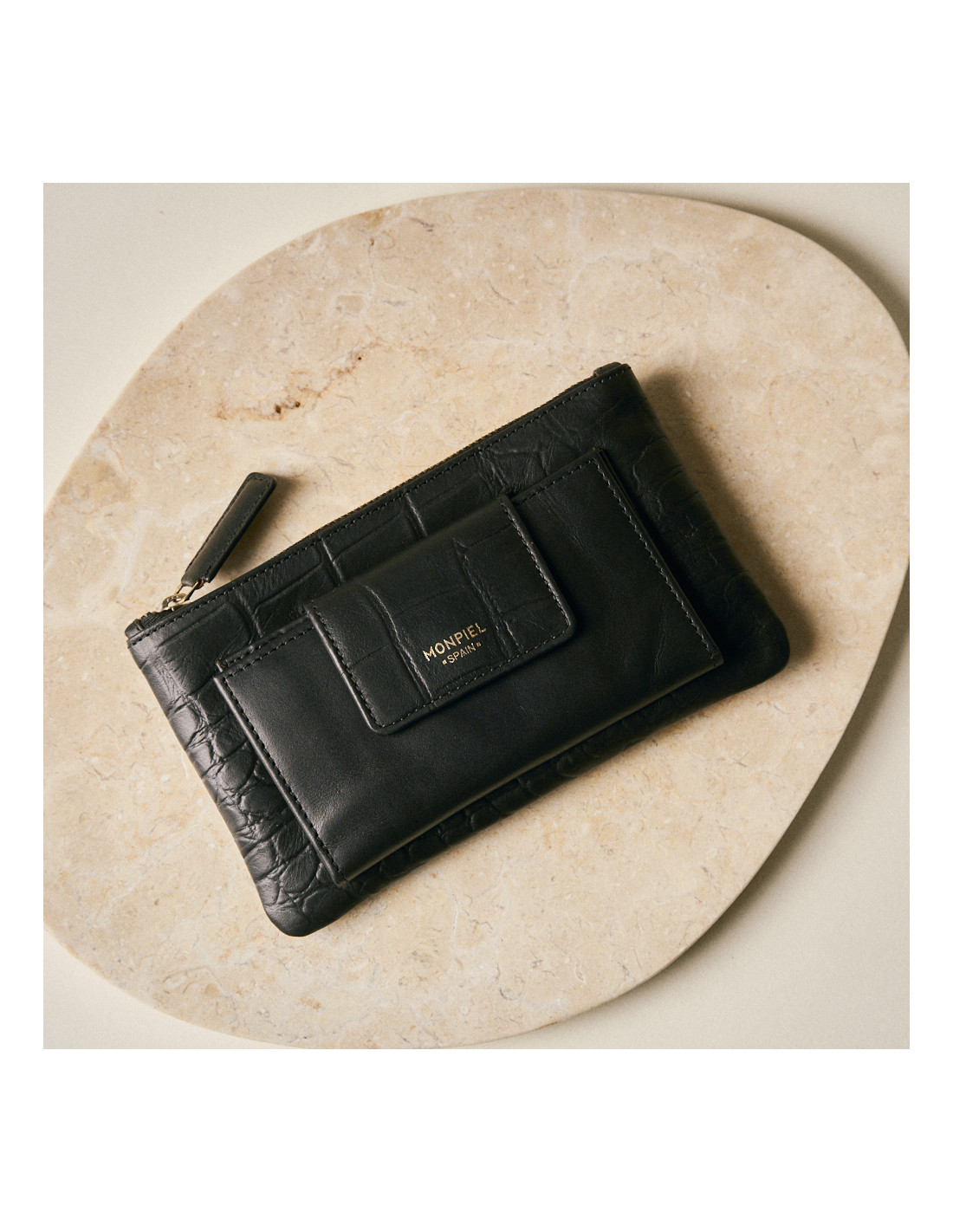 Portefeuille pour femme en cuir de vachette 100 % naturel, fabriqué de façon artisanale. Il s’agit d’un grand portefeuille en cuir, type pochette, d’un confort absolu. Il comprend une grande poche zippée pour la monnaie où vous pouvez ranger pièces, tickets ou même une carte. À l’extérieur, il possède une poche séparée avec des emplacements pour cartes et de l’espace pour des billets pliés. Une fermeture éclair supplémentaire à l’arrière permet de tout organiser encore plus facilement. Disponible en deux coloris, mélangeant cuir lisse et cuir embossé croco ou serpent.