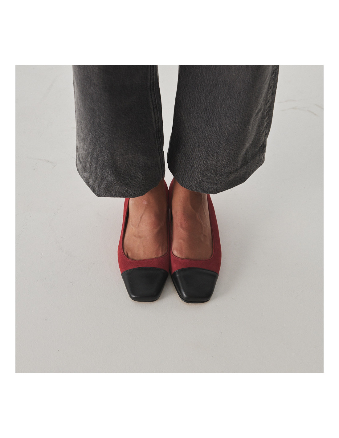 Chaussure en cuir pour femme à bout carré et design bicolore, confectionnée en daim 100 % naturel. Un modèle aux lignes actuelles et élégantes, inspiré par la sophistication parisienne.