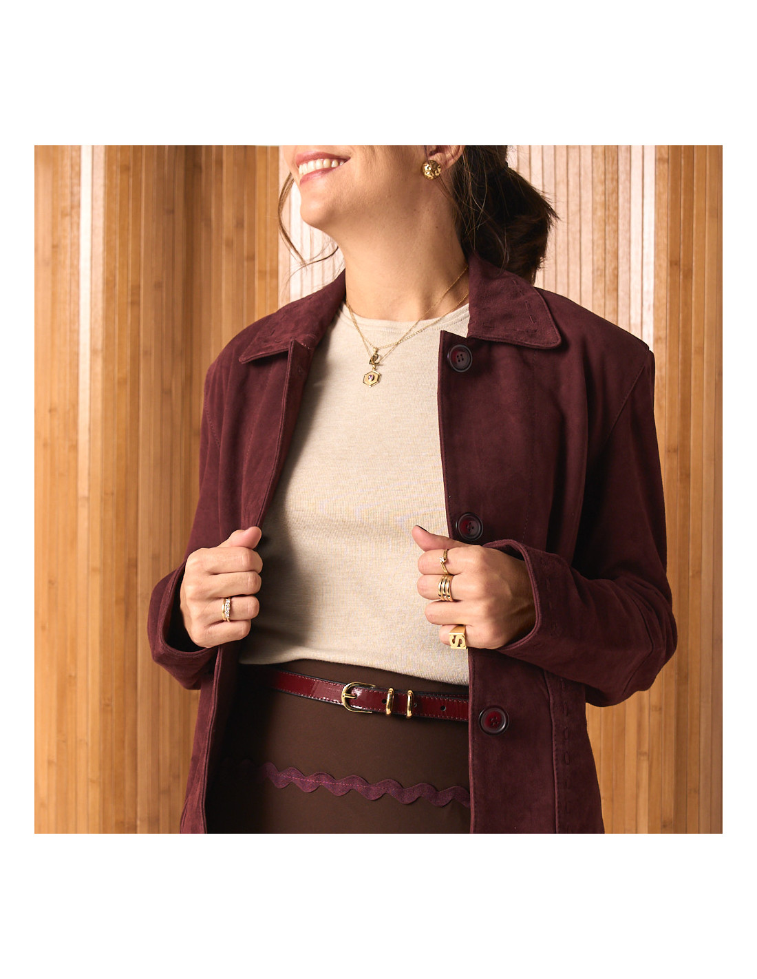 Cintura sottile in pelle da donna pensata per valorizzare qualsiasi outfit, dai più casual ai più eleganti. Con questo modello stretto con dettagli in oro su fibbia e passanti, avrai mille possibilità per abbinarlo al tuo guardaroba. Scegli il colore che meglio rispecchia il tuo stile — e te stessa.