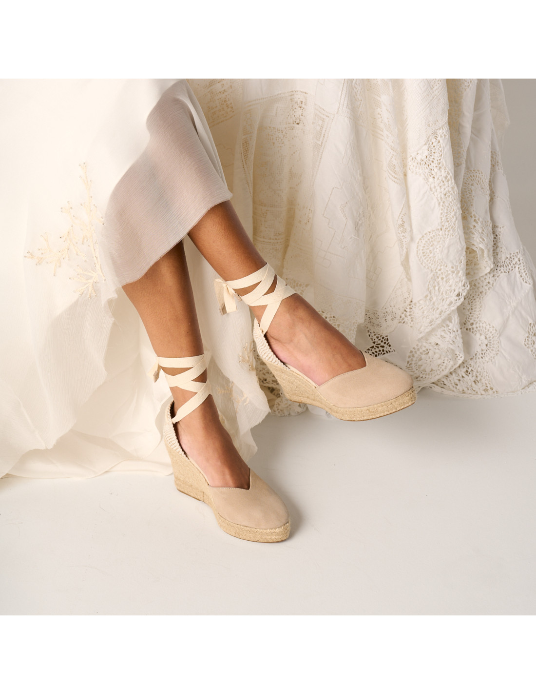 Espadrilla Elba con zeppa in pelle beige, vista prospettica e dettagli dei lacci - MONPIEL