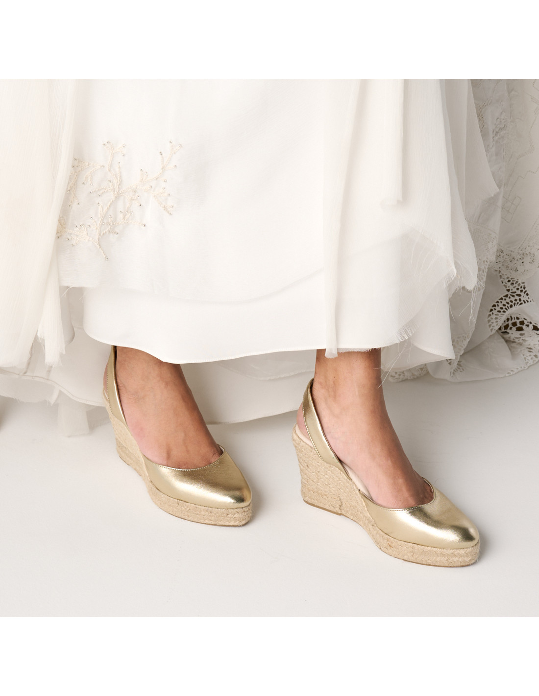 Zeppa in iuta di 9 cm, piattaforma di 2 cm realizzata in pelle. Puoi trovare questa nuova espadrilla in pelle color nude e, se sei più audace, la versione metallizzata perfetta per valorizzare il tuo look sia per un'occasione speciale durante le notti d'estate. Ora in camoscio cuoio e camoscio nero.