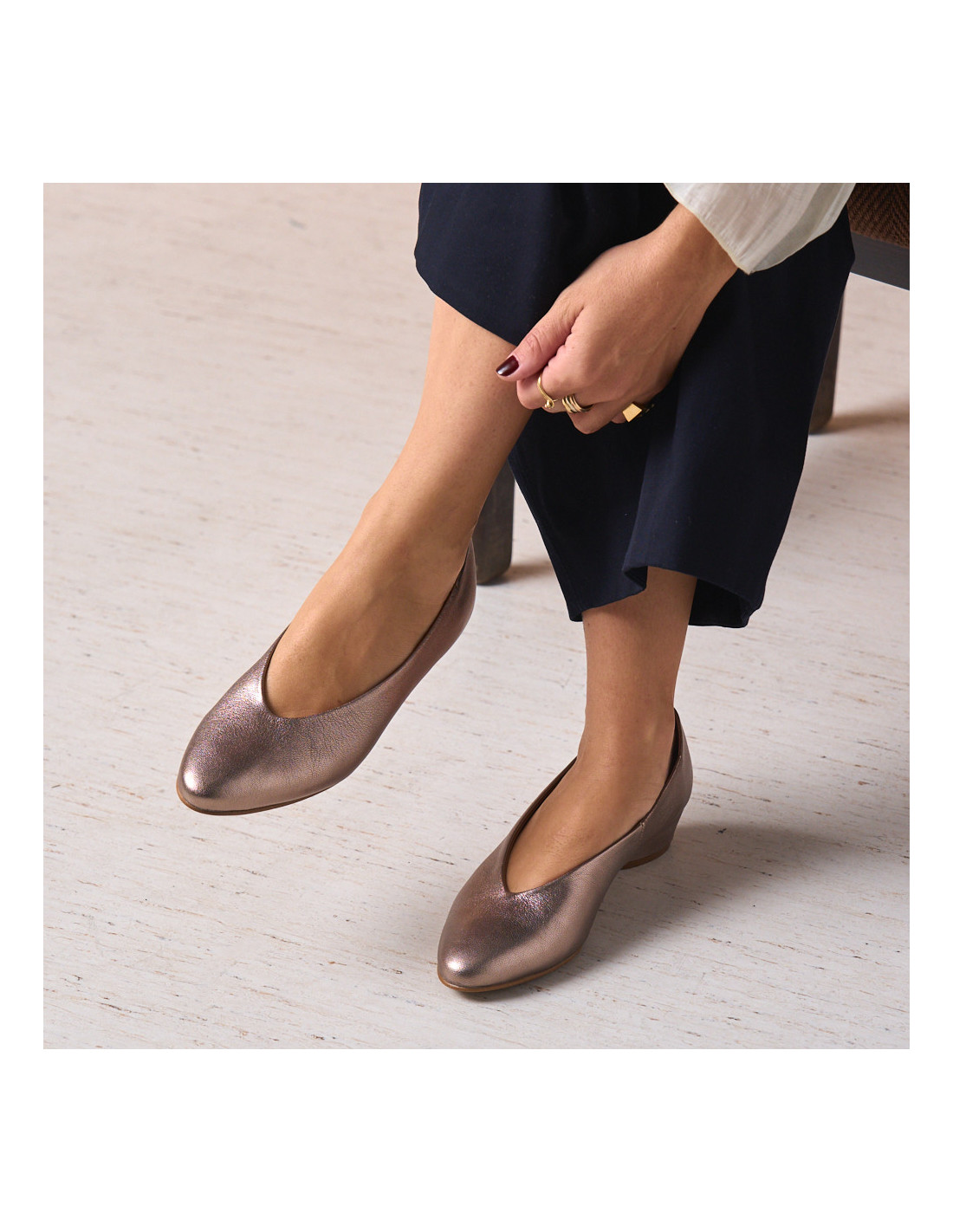 Ballerina con tacco color cappuccino bronzo con primo piano delle gambe, vista frontale e di profilo - MONPIEL