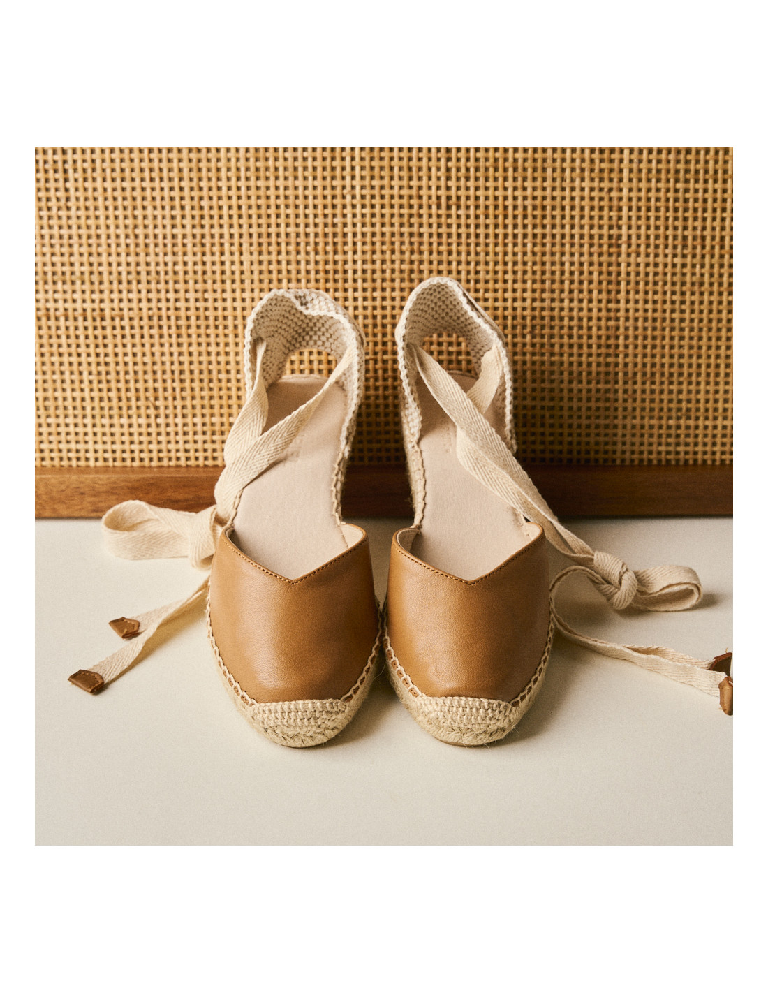 Es una alpargata de piel auténtica, con una cuña media de 5,5 cm confeccionada con yute natural, y un empeine con escote en forma de pico, un detalle que estiliza y alarga visualmente el pie. El juego de la lazada de algodón con terminación en piel permite un ajuste delicado y cómodo a tu gusto.