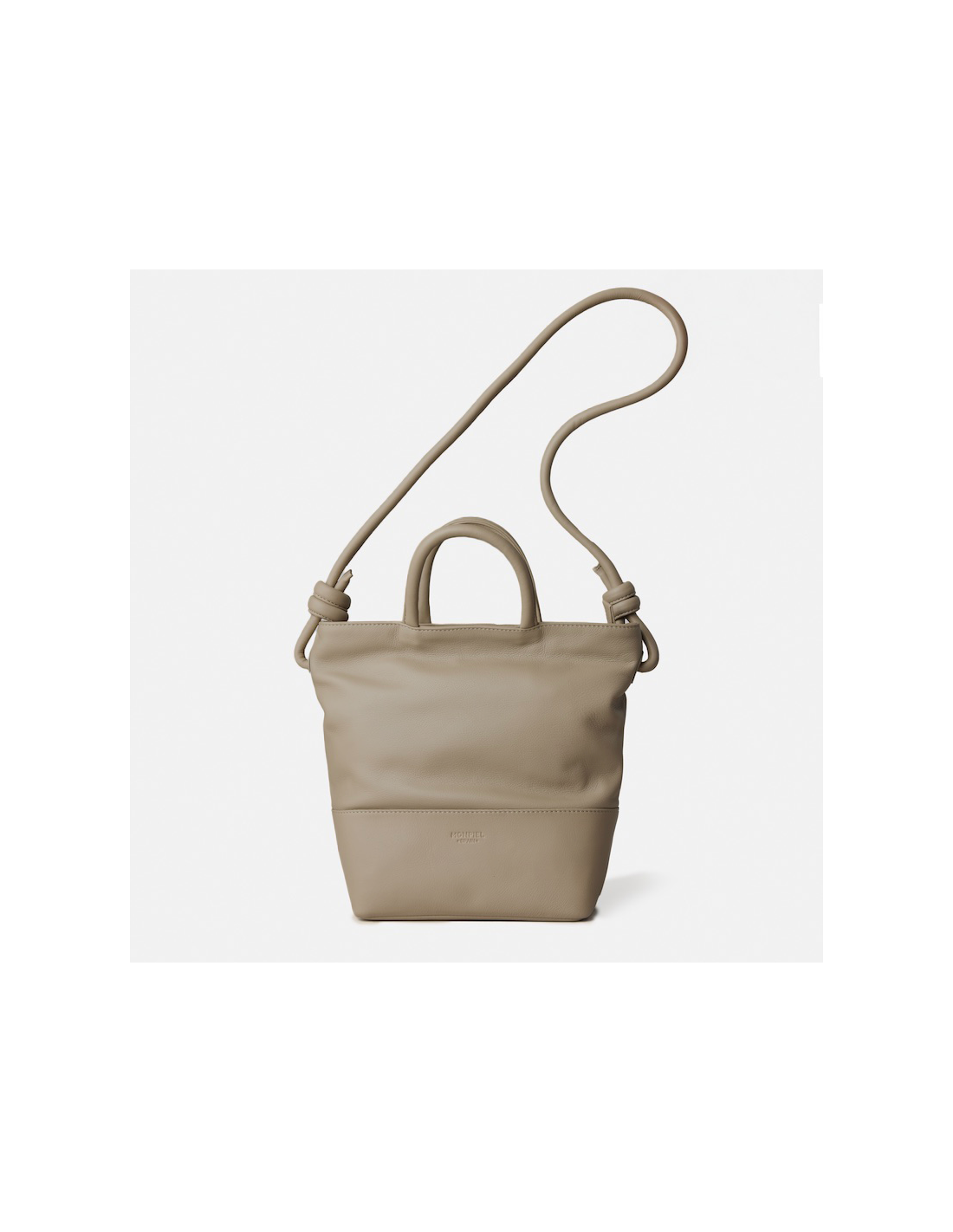 Bolso grande nudos de piel en color topo con vista frontal colgando de las manos - MONPIEL