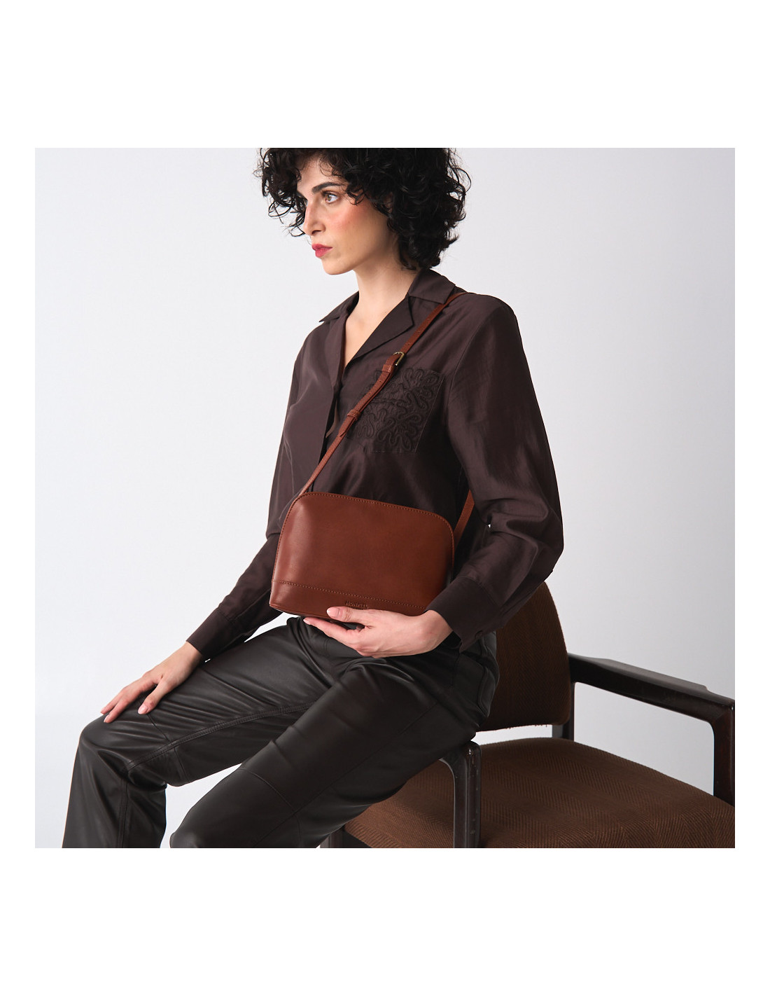 Bolso mediano de piel en color cuero colgado al hombro con vestido - MONPIEL