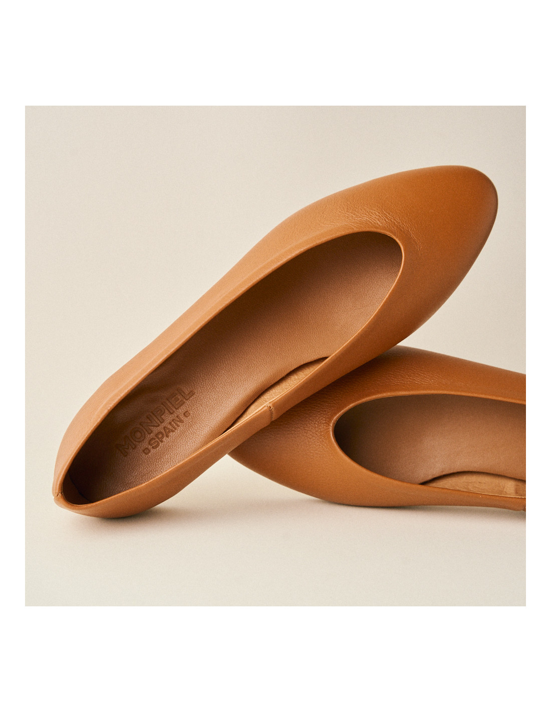 Bailarina plana en color cuero con vista en perspectiva y perfil ampliada con las piernas en fondo blanco - MONPIEL