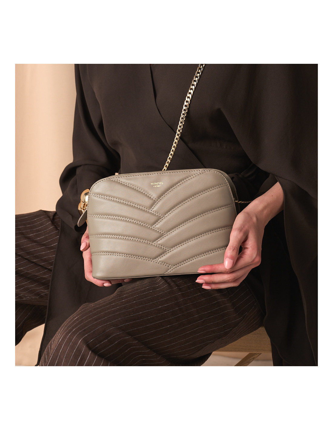 Bolso de piel acolchado para mujer de tamaño mediano con cadena dorada. Un bolso de cuero con diseño clásico pero actualizado. Toda mujer necesita en su clóset un bolso de calidad con cadena dorada — la cadena aporta ese toque vintage y sofisticado que realza tanto un look formal como uno casual. Solo necesitas jugar un poco con las combinaciones para llevarlo a la oficina o incluso a una boda. El complemento perfecto para cualquier ocasión.