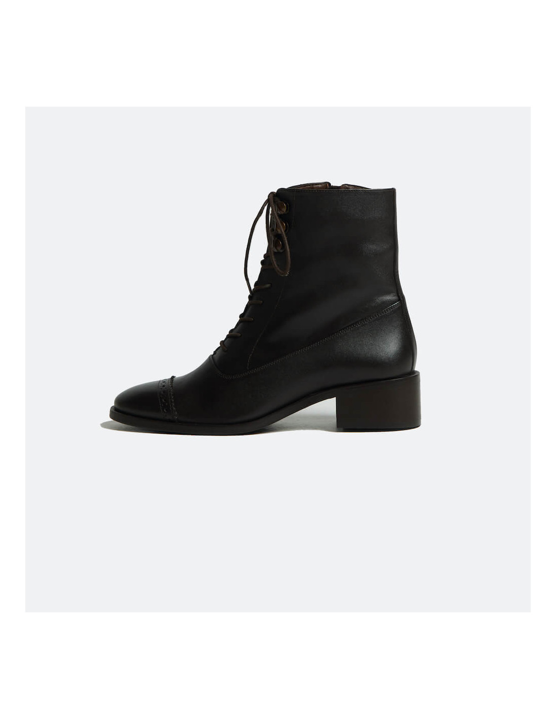Un botín de piel para mujer clásico con detalles especiales. Las costuras visibles, especialmente la costura decorativa en la puntera ligeramente redondeada, y los detalles dorados al inicio hacen que sea un calzado totalmente único y original — perfecto para el invierno.