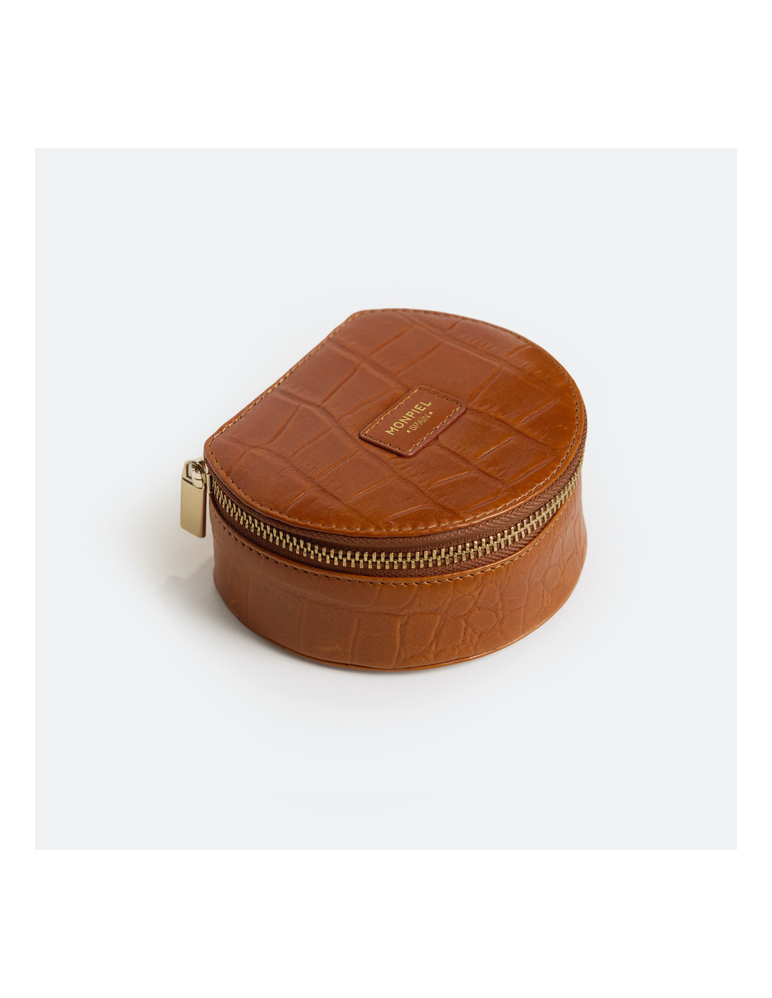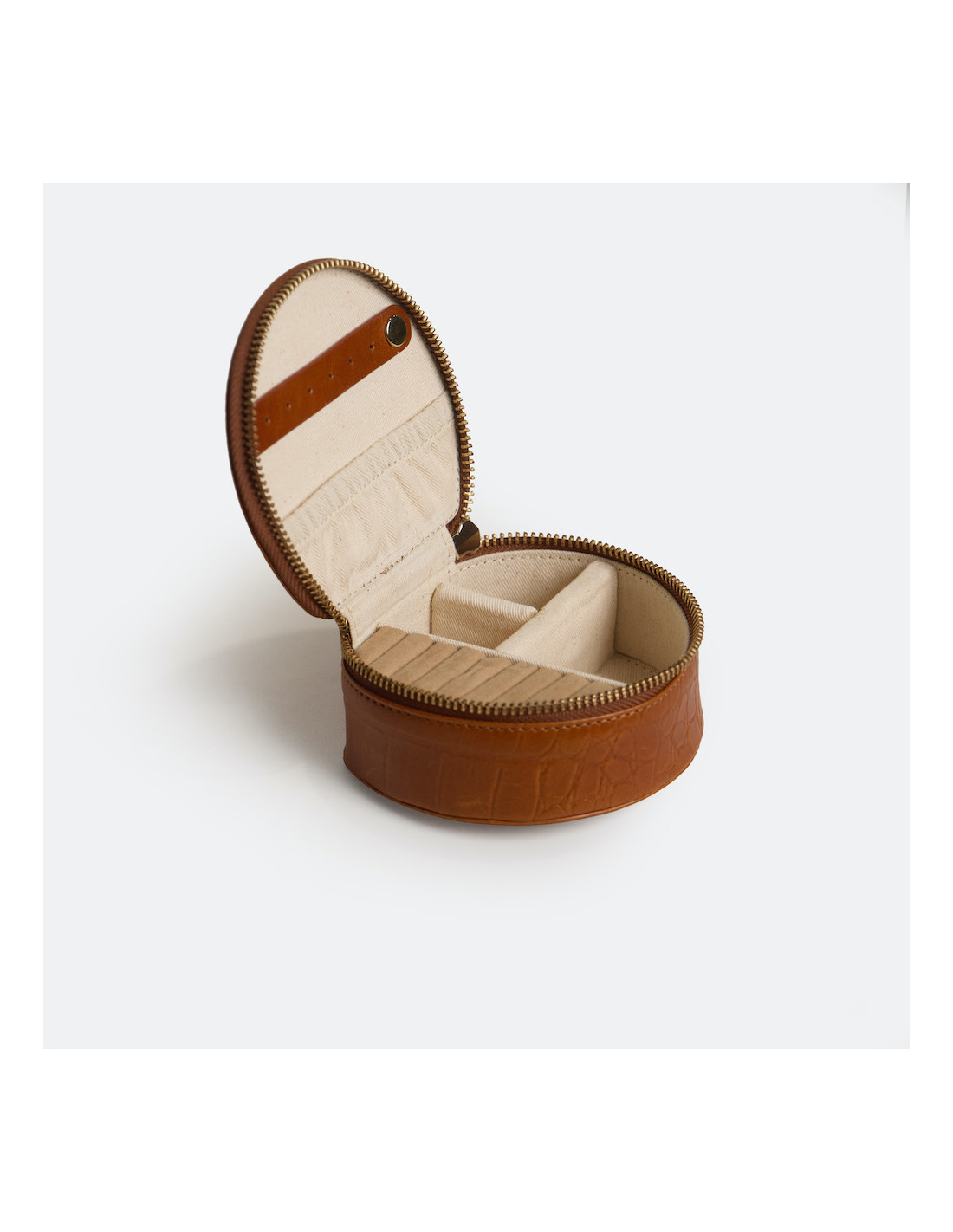 Este joyero redondo de piel para mujer está hecho en cuero 100% natural. Gracias a su diseño compacto, es ideal para llevar de viaje o mantener tus joyas ordenadas en casa, y también cuenta con un cierre de cremallera que asegura su contenido con total confianza. Su interior está forrado con un tejido suave para proteger cada pieza con cuidado e incluye compartimentos específicos para anillos, aretes y pequeños accesorios.