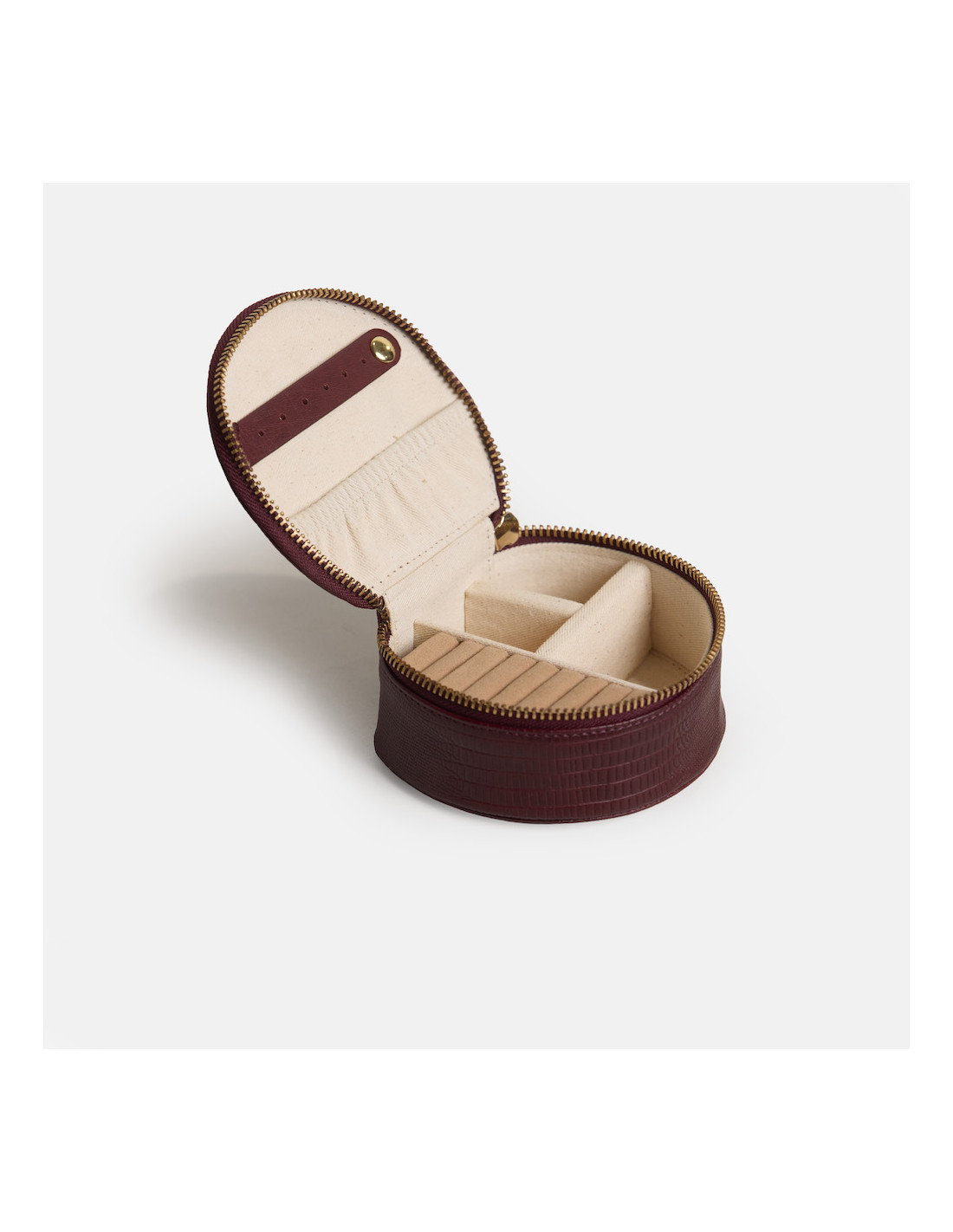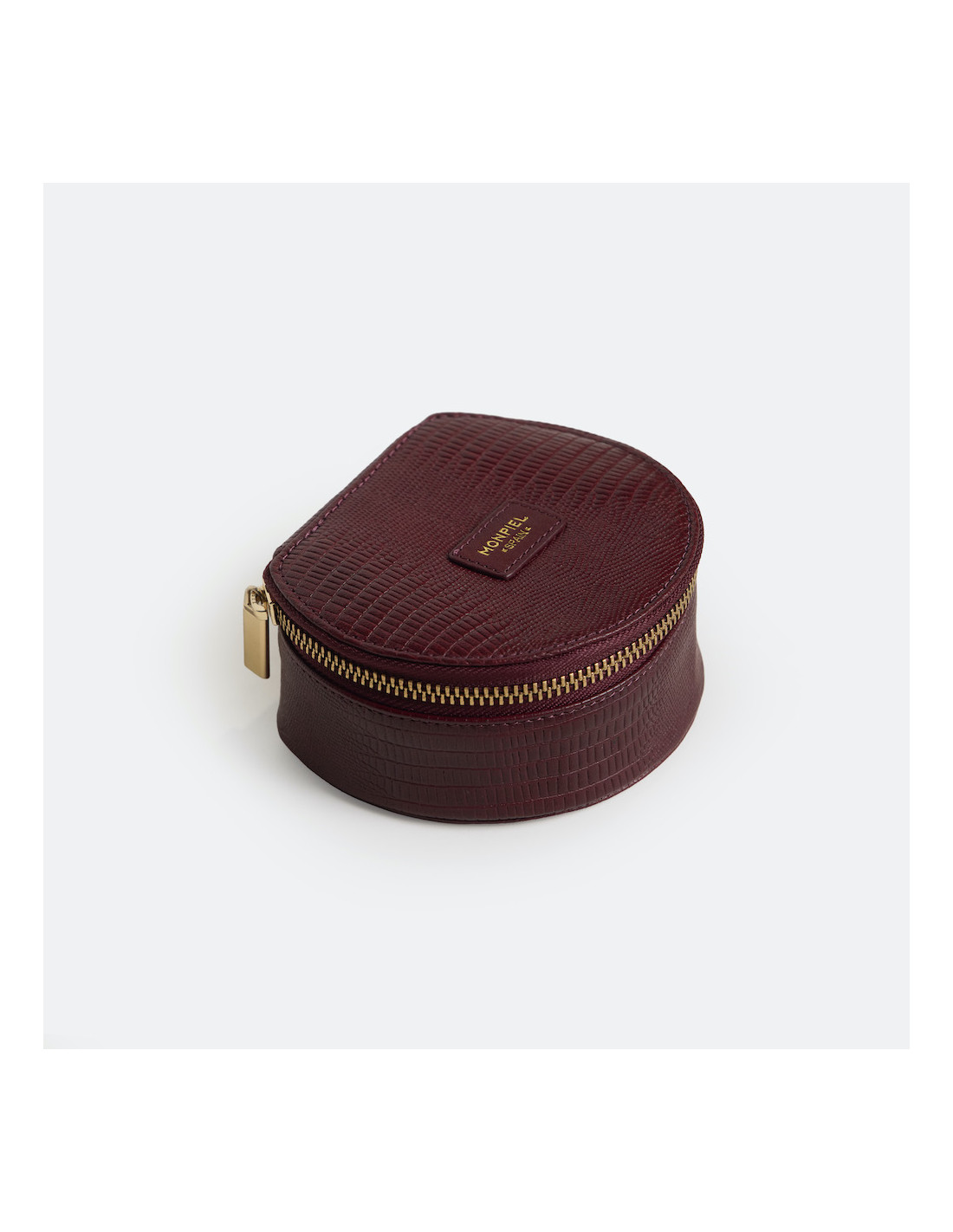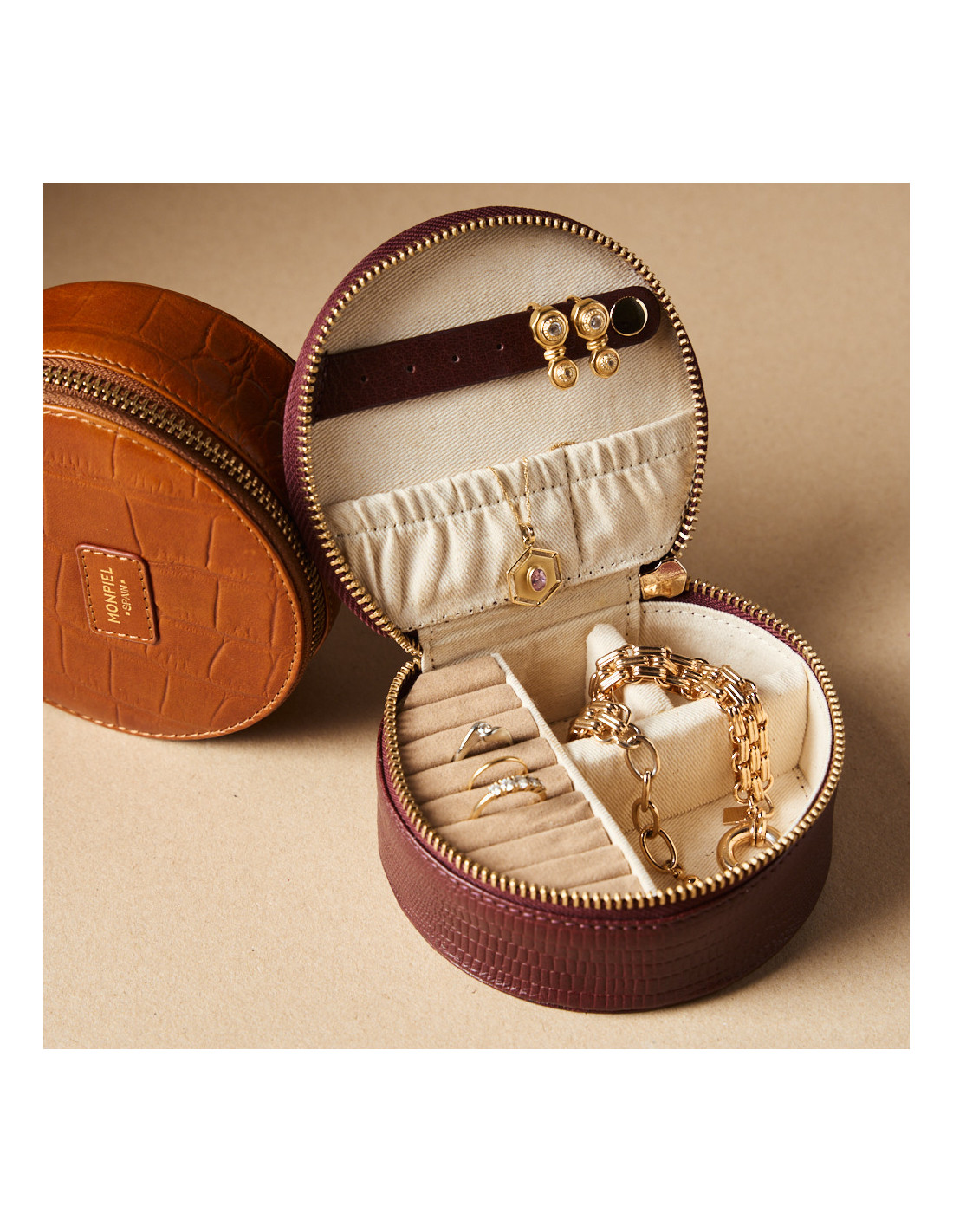 Este joyero redondo de piel para mujer está elaborado en cuero 100% natural. Gracias a su diseño compacto, es ideal para llevar de viaje o mantener tus joyas ordenadas en casa, y además cuenta con un cierre de cremallera que asegura su contenido con total confianza. Su interior está forrado con tejido suave para proteger cada pieza con mimo e incluye compartimentos específicos para anillos, pendientes y pequeños accesorios.