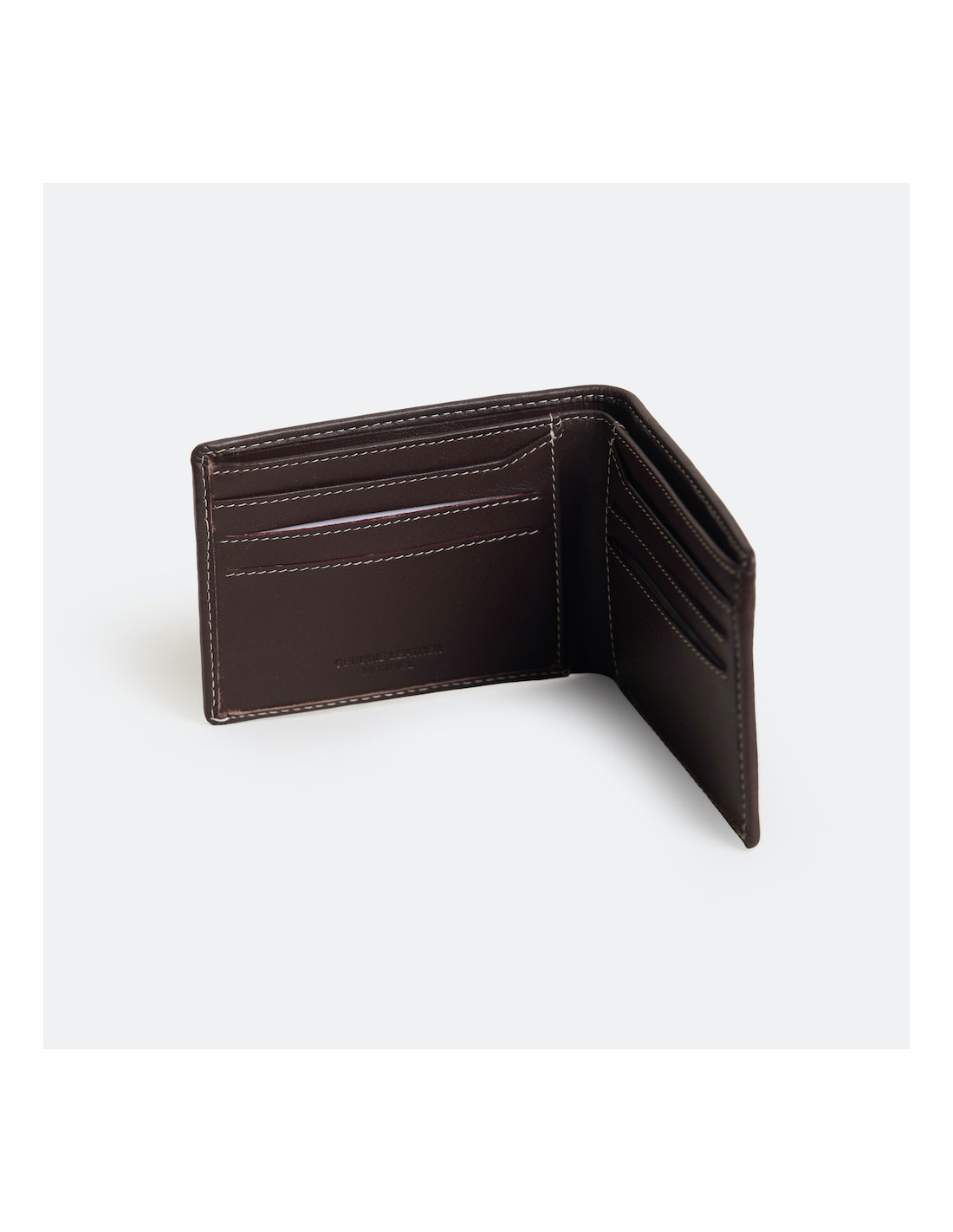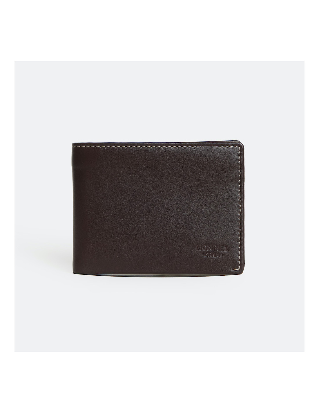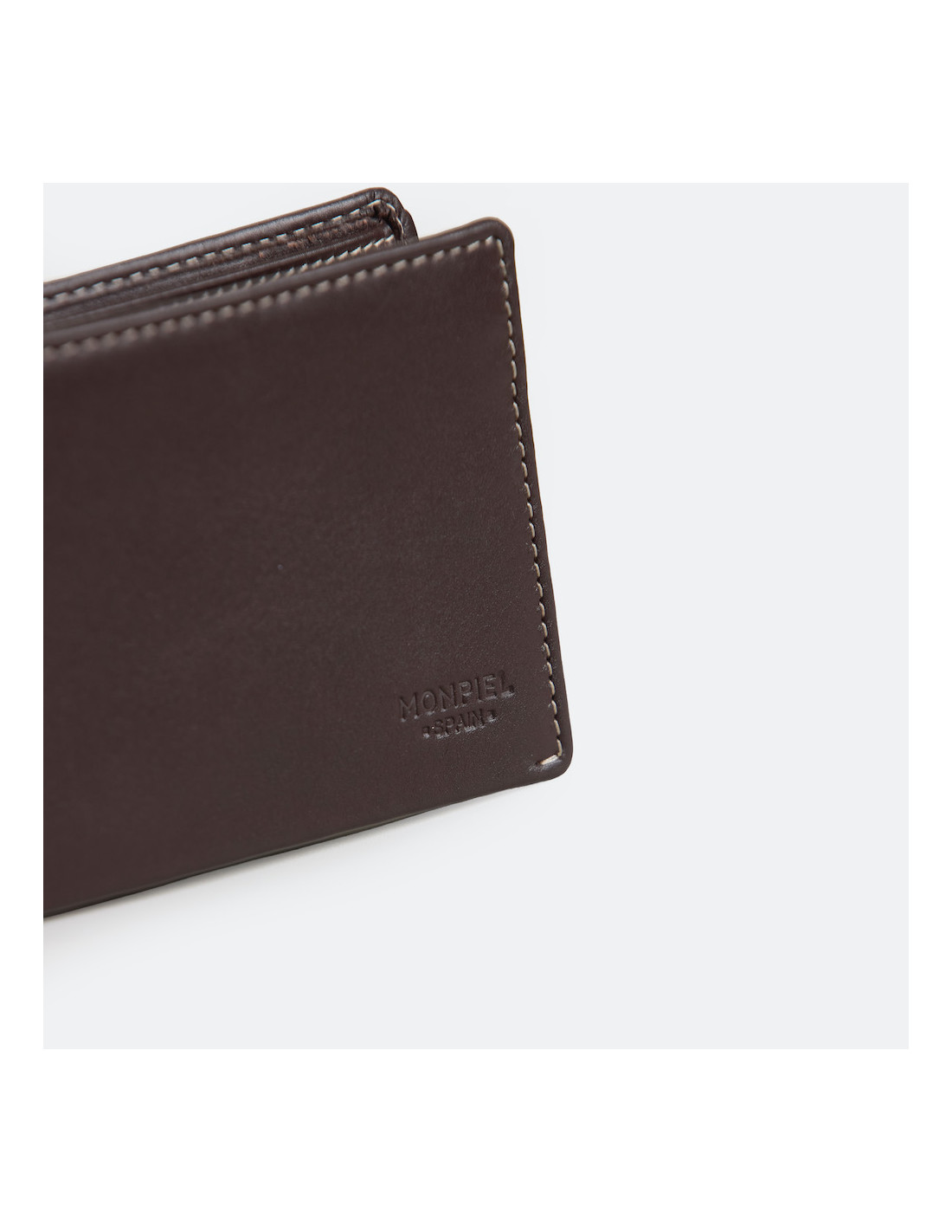 Caixa para carteira de couro masculina com compartimento para cédulas e porta-moedas sobre fundo branco - MONPIEL