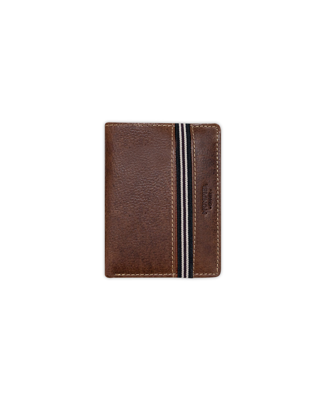 Carteira de couro marrom com elástico, vista frontal sobre fundo branco - MONPIEL