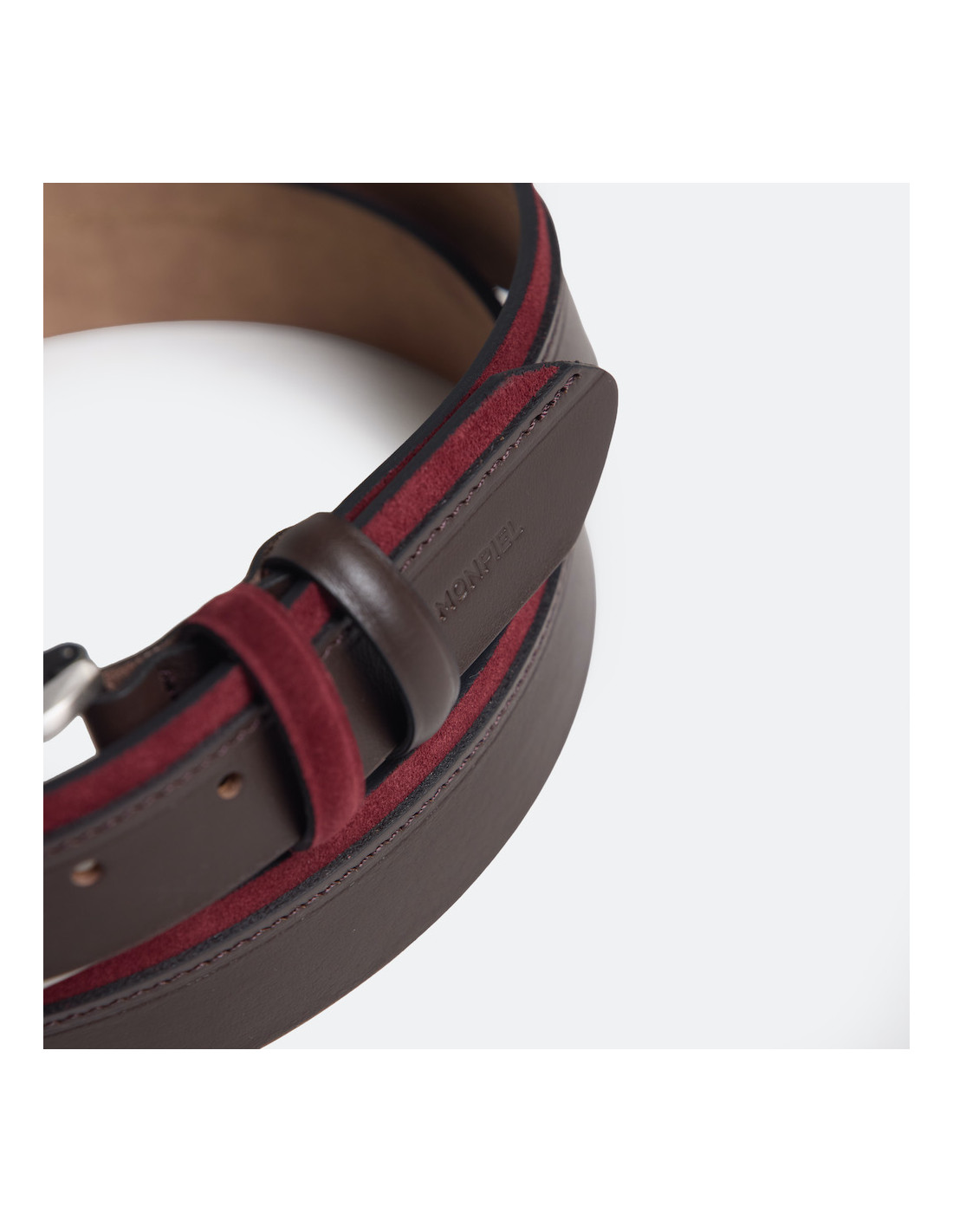 Cinto de couro de vaqueta misturado com camurça. Este cinto de couro para homem tem um design inovador e distinto, dando aos seus looks um toque de elegância com este design exclusivo. Acabamento perfeito dos melhores artesãos de marroquinaria espanhóis e uma mistura de cores que você poderá combinar no dia a dia. Feito à mão na Espanha com couros de primeira qualidade. Disponível em 3 cores: marinho, bordô e havana.