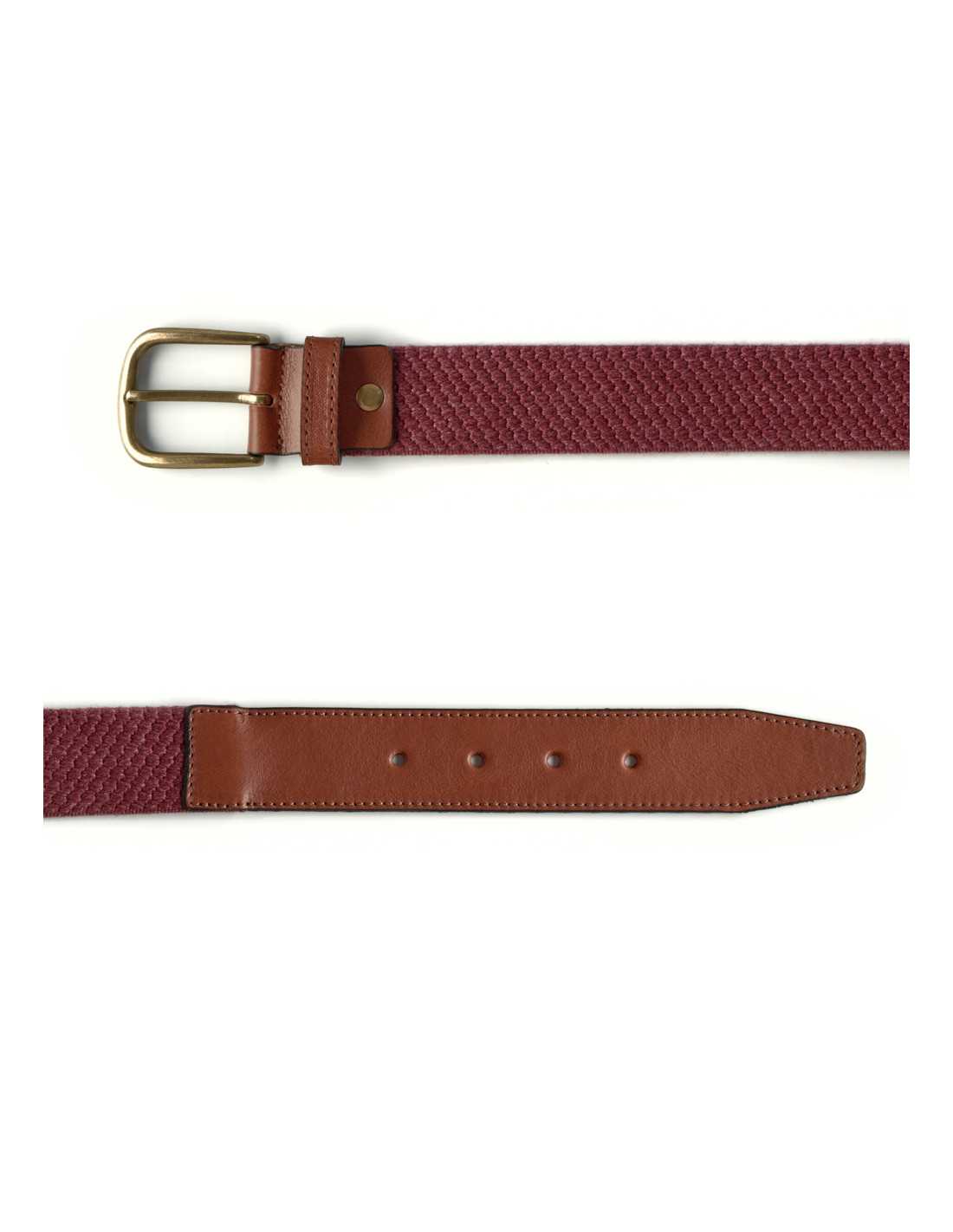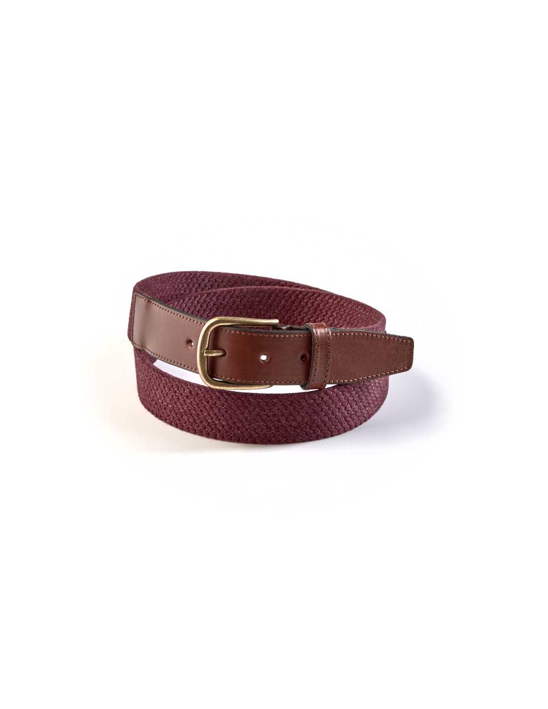 Cinto elástico masculino de couro bordô, enrolado sobre fundo branco - MONPIEL