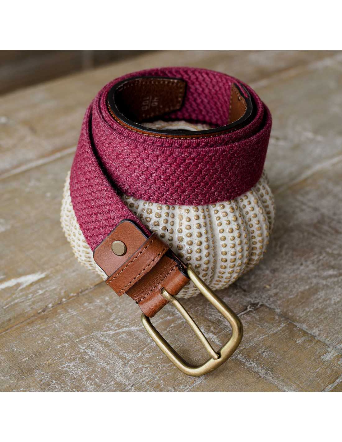 Cinto elástico masculino de couro bordô, enrolado sobre cerâmica - MONPIEL
