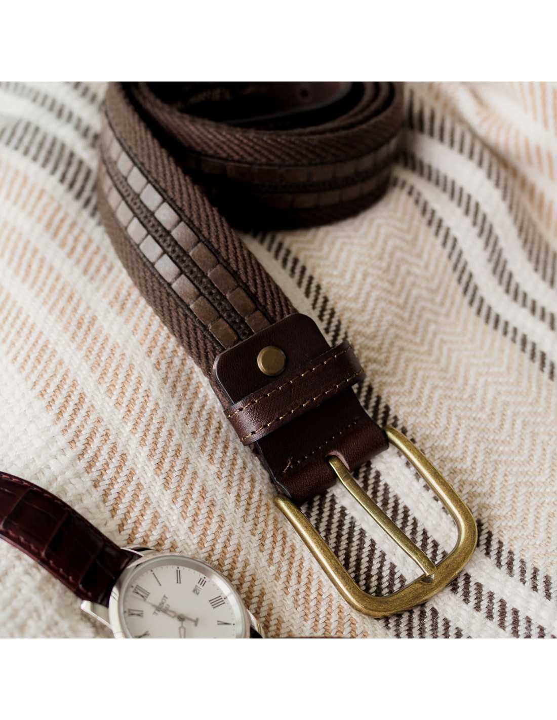 Cinto masculino de lona e couro marrom, vista frontal sobre fundo branco - MONPIEL
