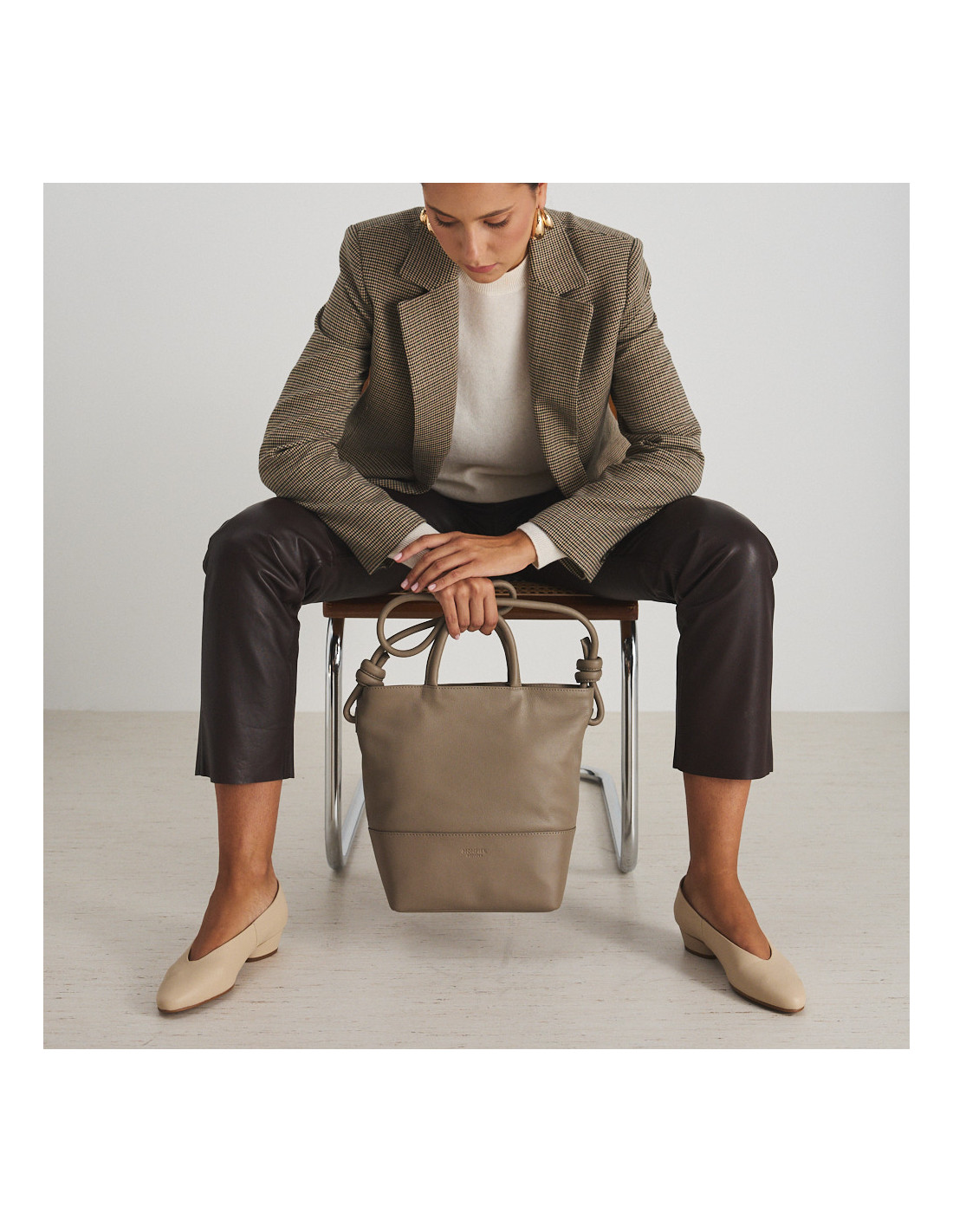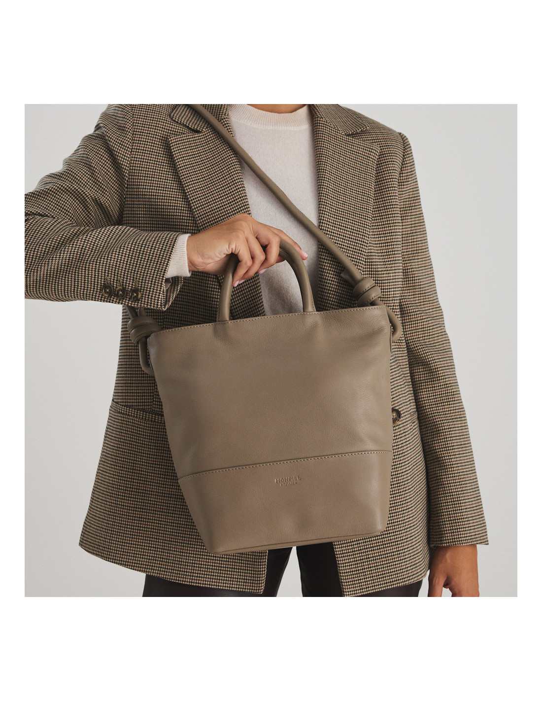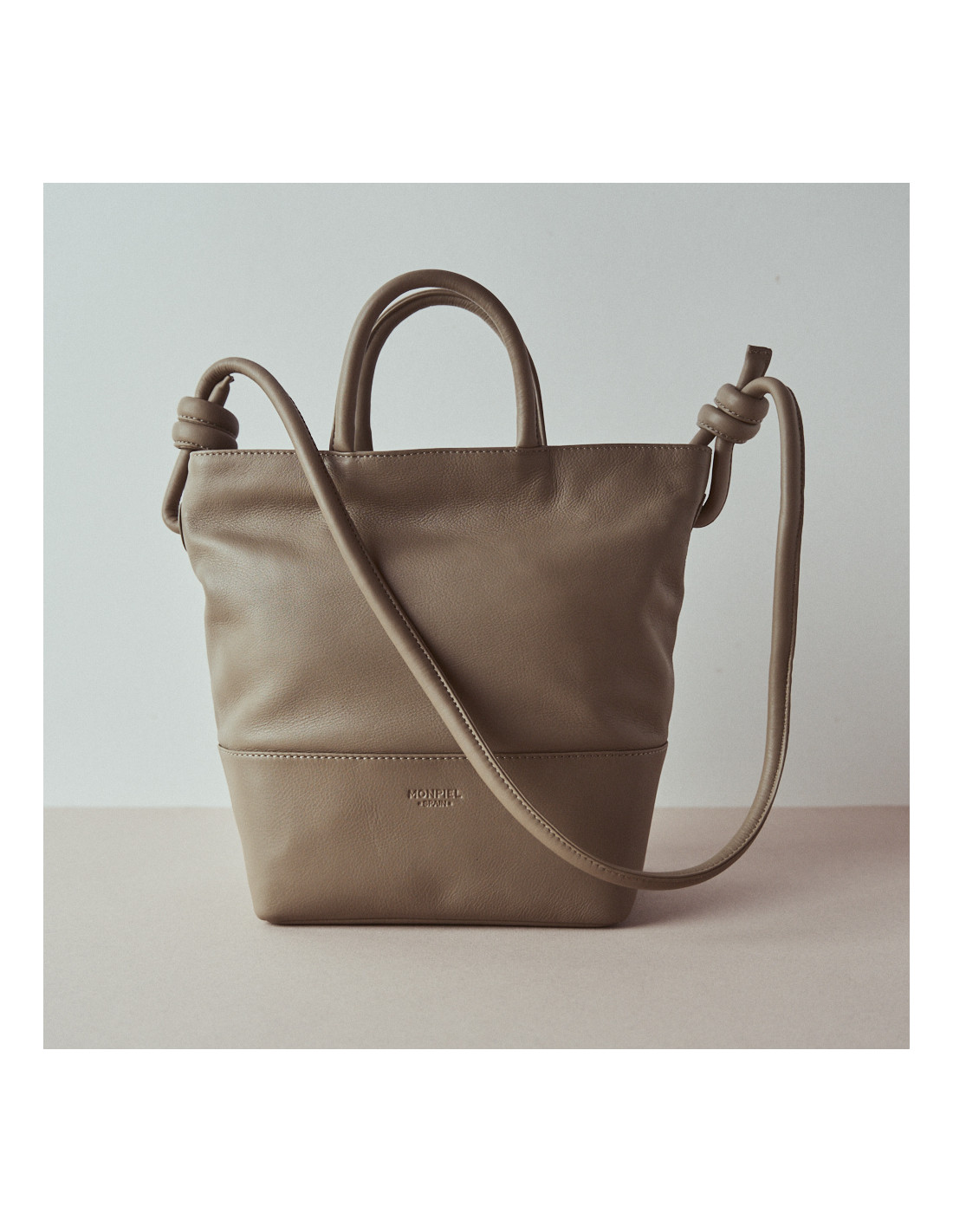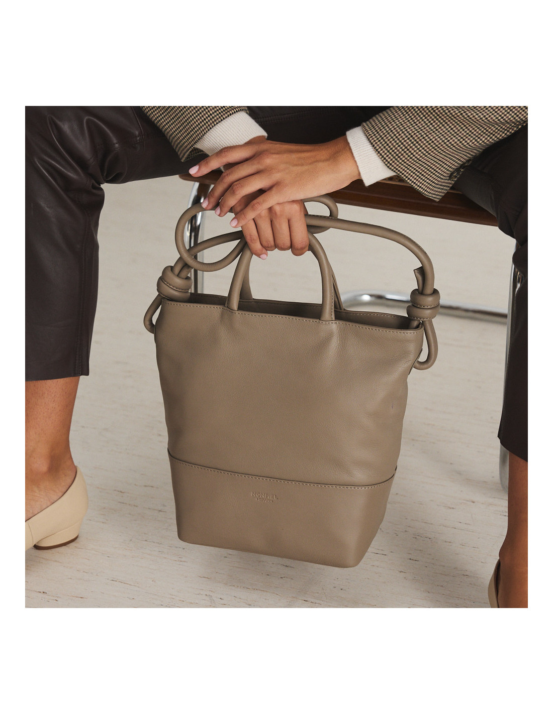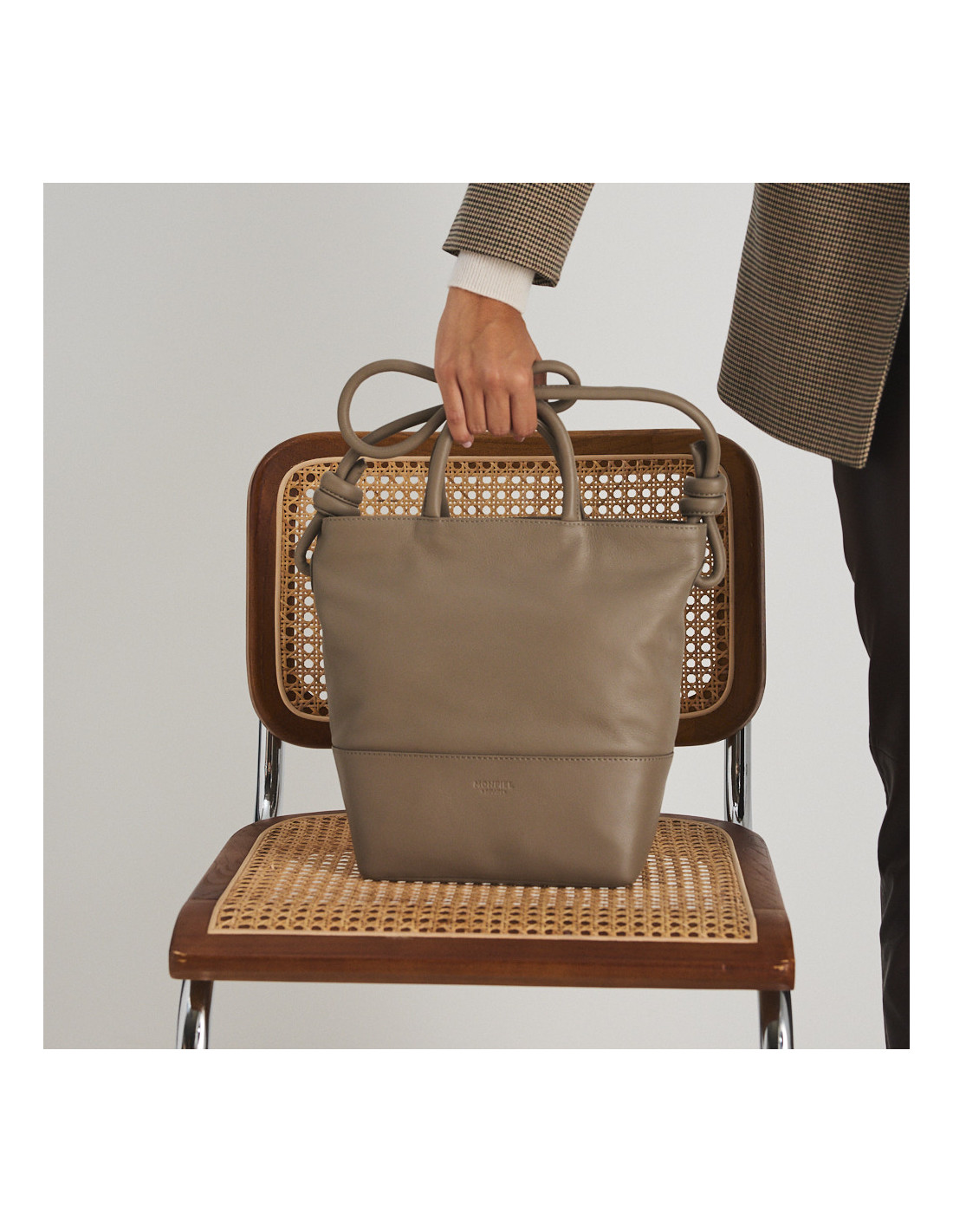 Bolsa grande de couro com nós na cor taupe, vista frontal e detalhe da alça com fundo de parede - MONPIEL