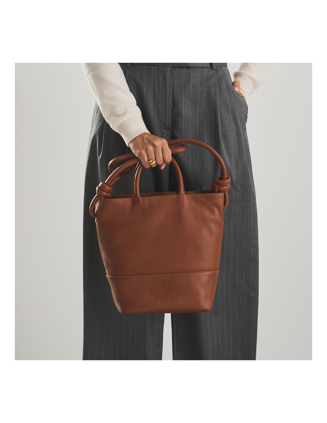 Bolsa grande com nós de couro na cor preta segurando as alças curtas, bolsa em movimento - MONPIEL
