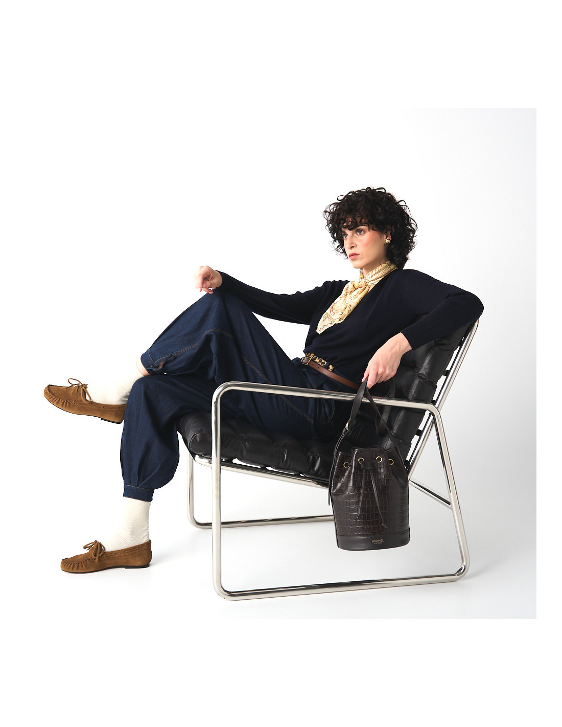 Bolsa saco bombonera grande de couro em tom marrom crocodilo, vista frontal, em frente a um jarro - MONPIEL