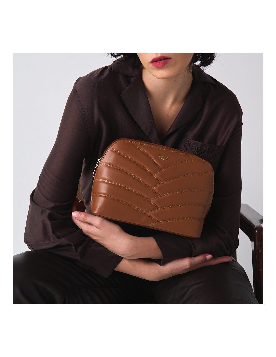 Bolsa de couro acolchoada com corrente dourada na cor couro em primeiro plano com zíper aberto - MONPIEL