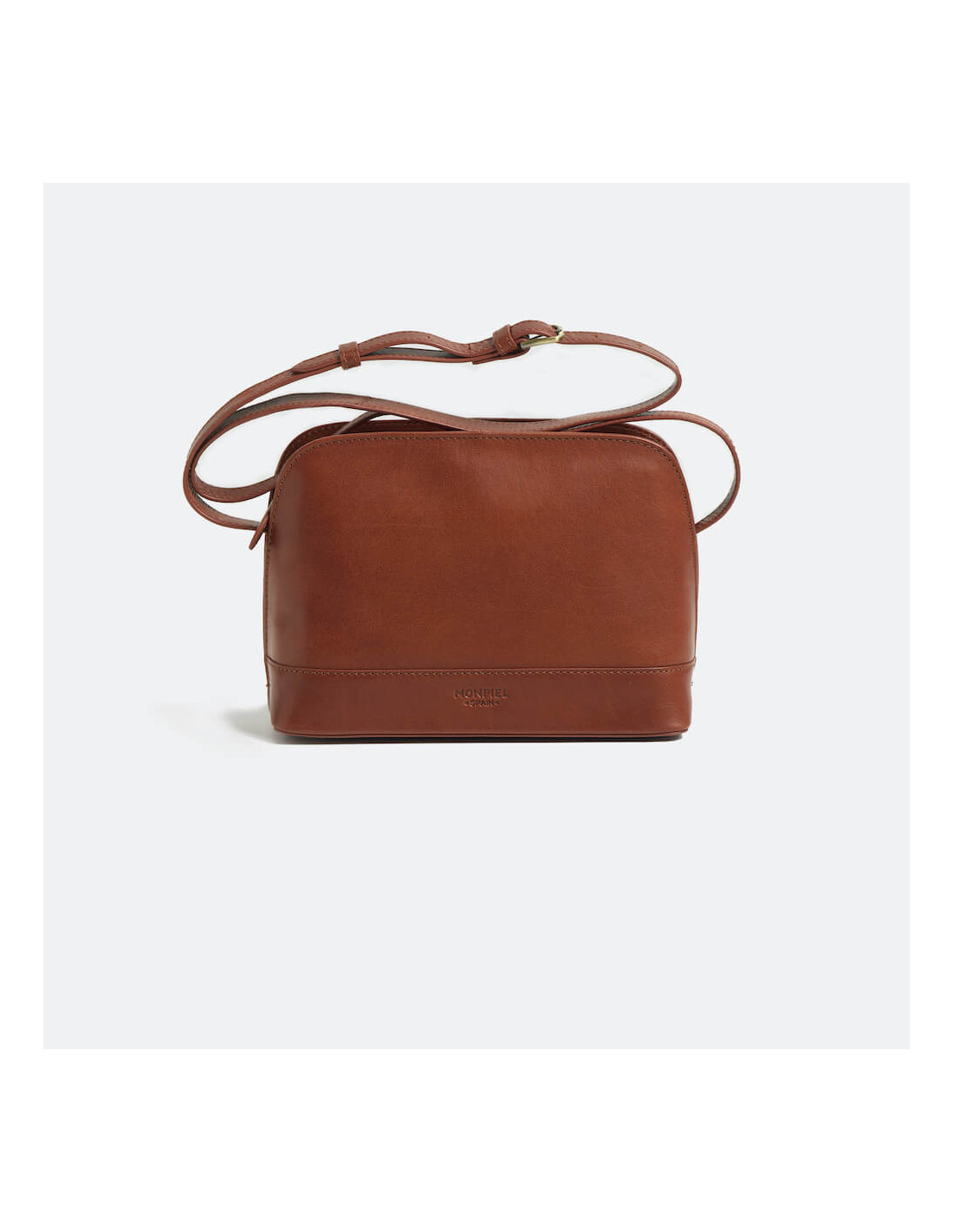 Bolsa média de couro marrom, vista frontal ao ombro - MONPIEL