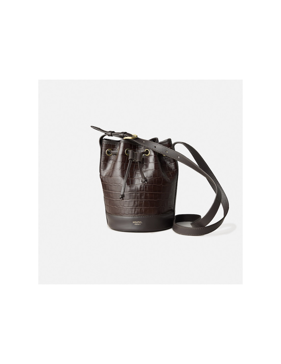 Bolsa saco bombonera pequena de couro em tom marrom crocodilo com vista frontal apoiada em madeira - MONPIEL