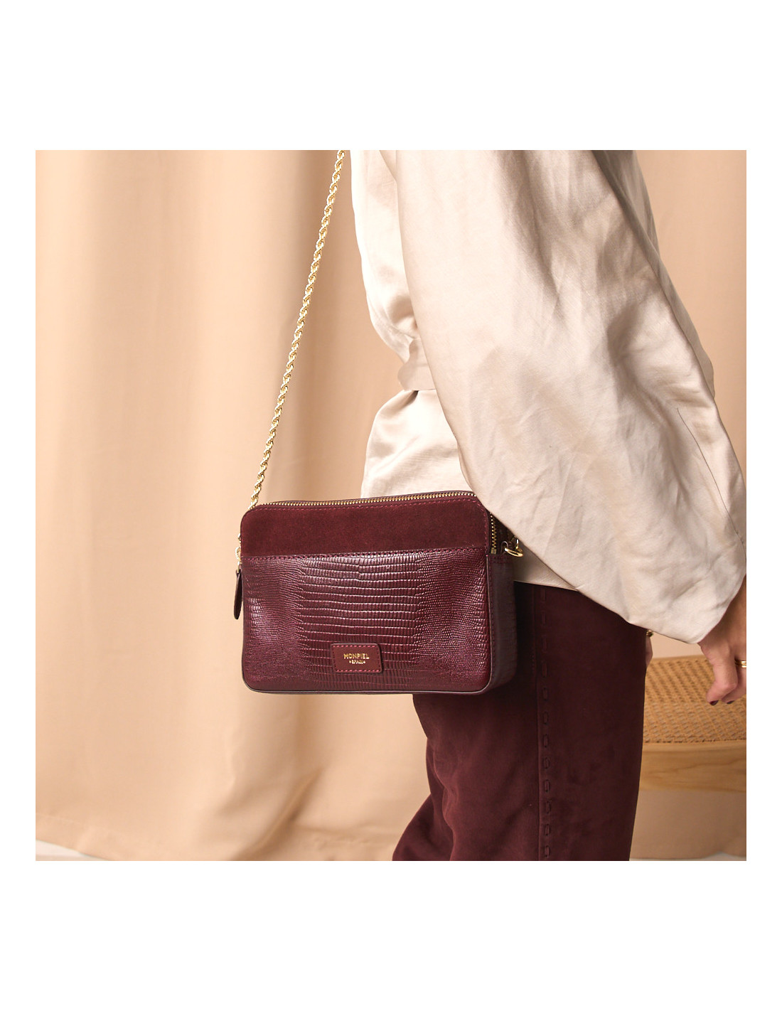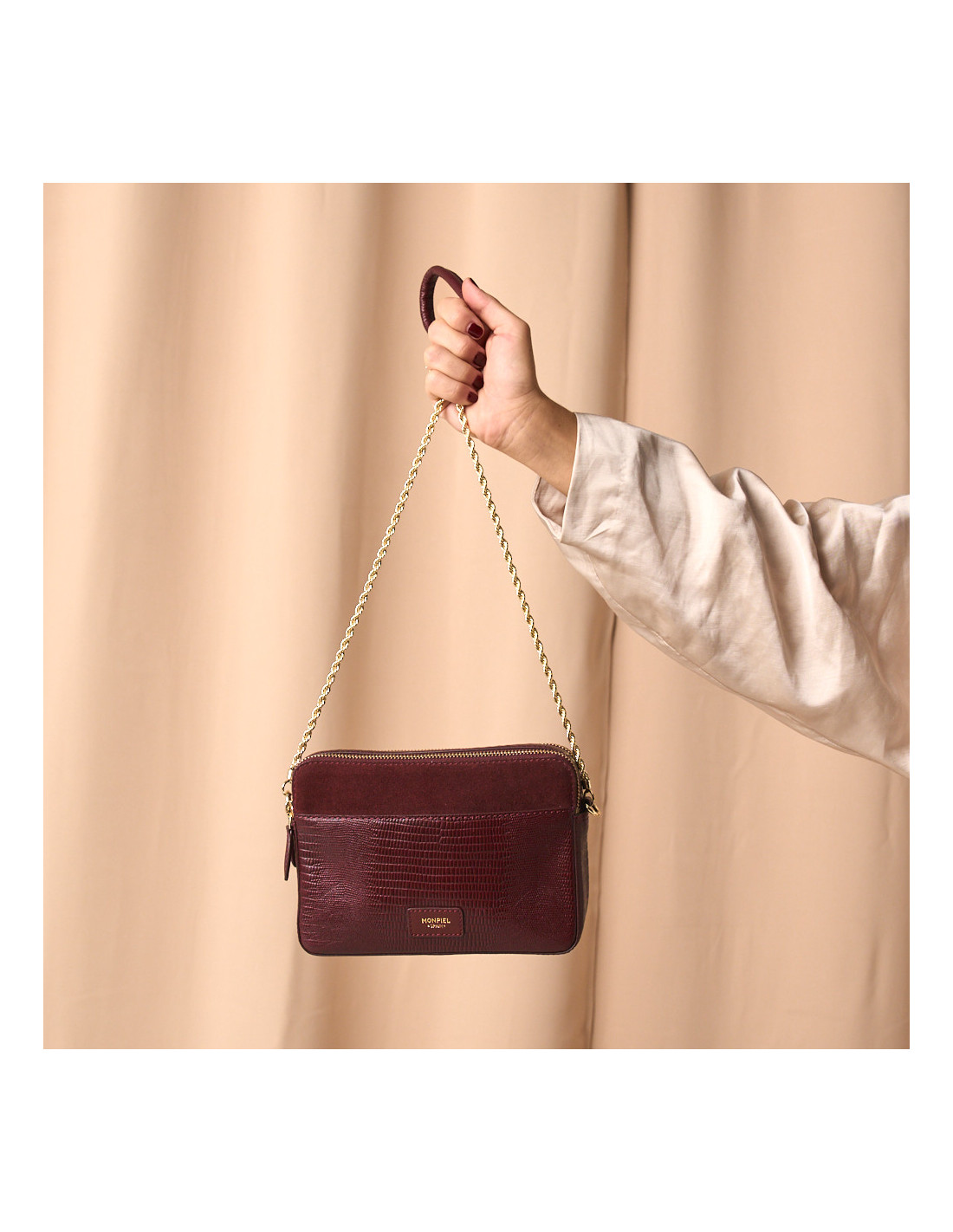 Desenhada para brilhar com subtileza, esta bolsa tiracolo para mulher feita em pele 100% natural combina funcionalidade e estilo com um acabamento impecável. A corrente dourada adiciona um toque sofisticado que a torna perfeita tanto para eventos formais como para os planos mais casuais.