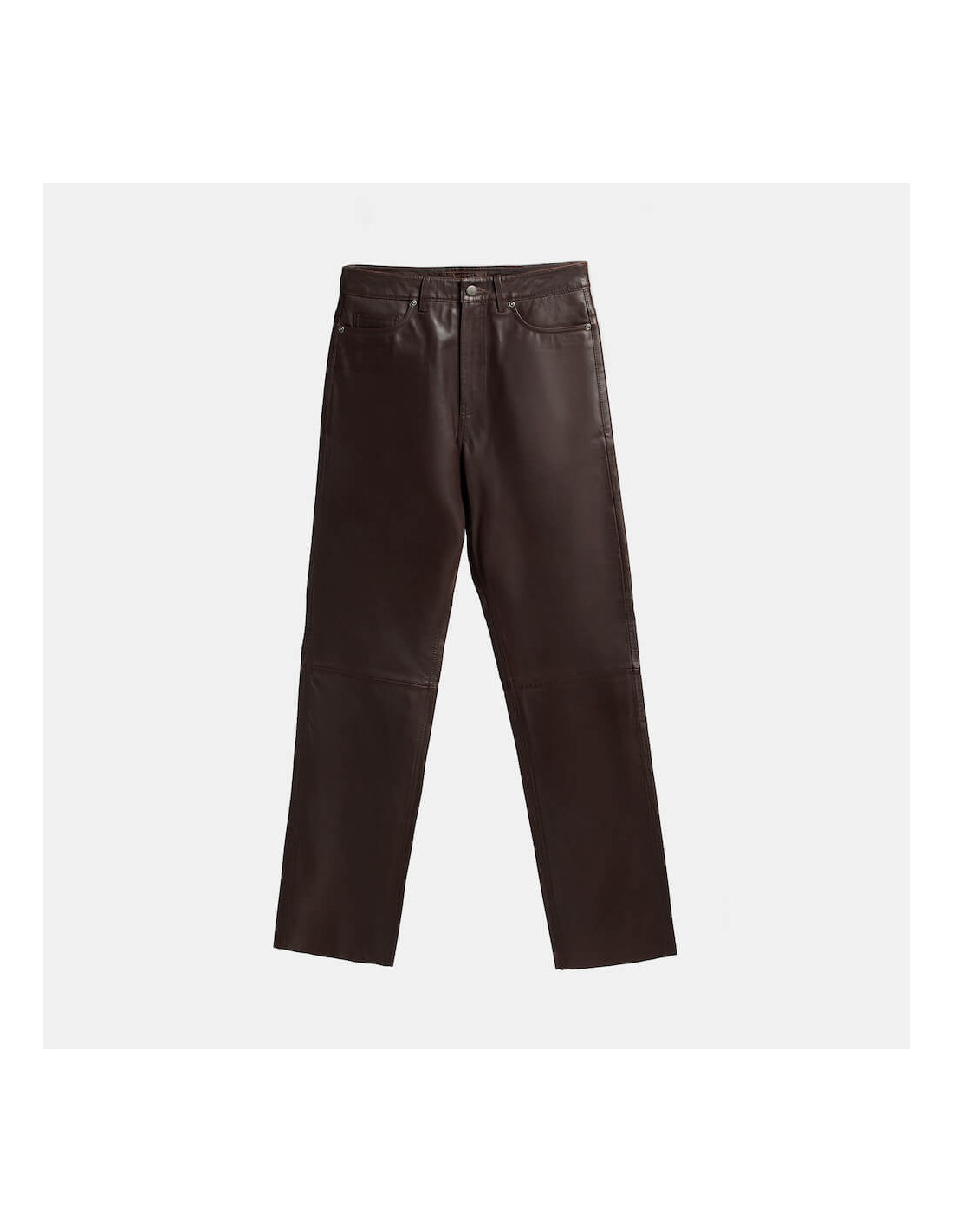 Calça de couro elaborada em couro 100% com corte de cintura alta e perna reta, sua costura na altura do joelho fará você parecer mais alta. O couro de alta qualidade proporciona a essa calça uma textura suave, enquanto realça sua durabilidade e resistência, tornando-se uma peça que perdura no tempo. Seu ajuste favorecedor e corte realçarão sua figura.