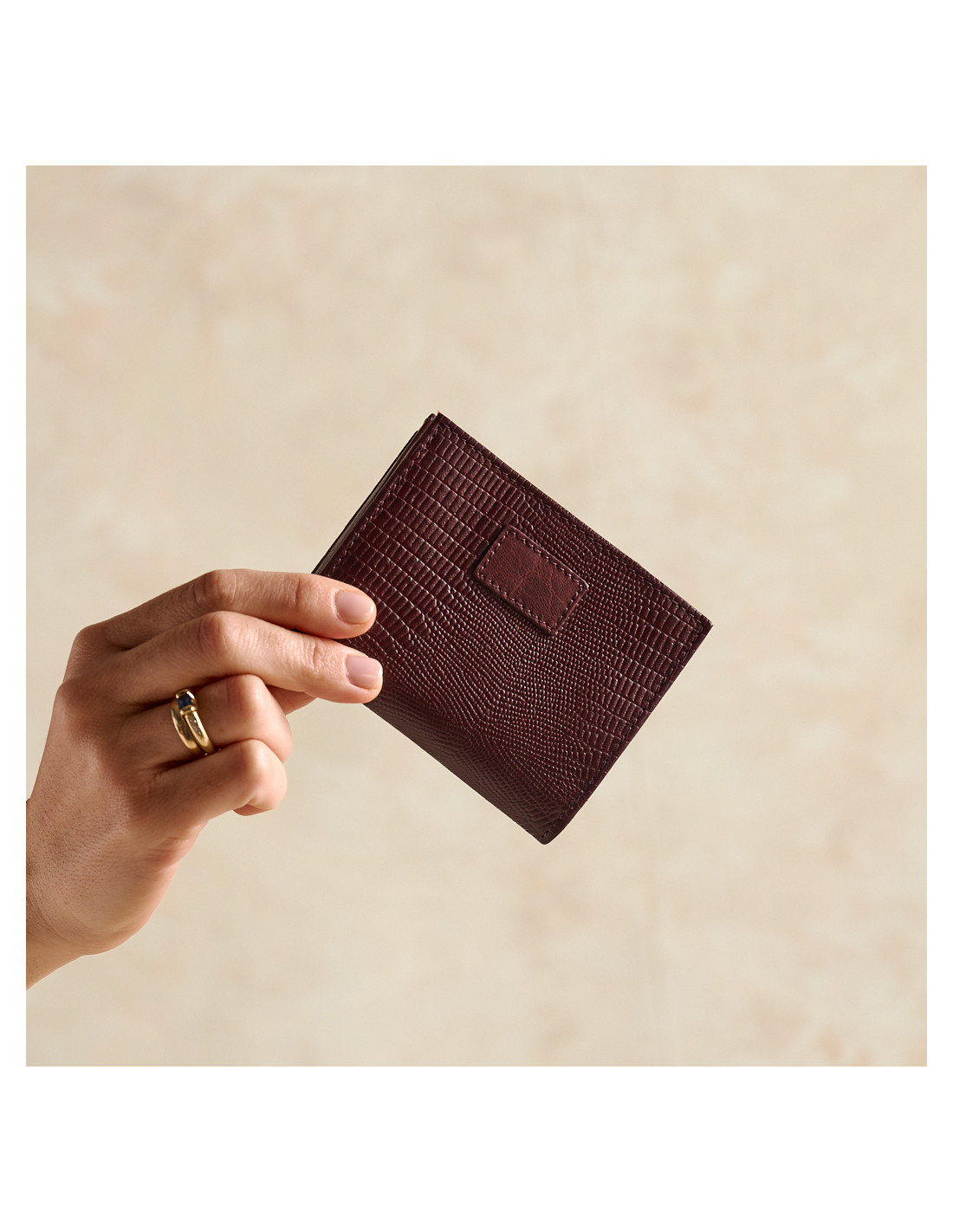 Carteira pequena com porta-moedas em pele efeito serpente bordô sobre fundo branco, ligeiramente inclinada - MONPIEL