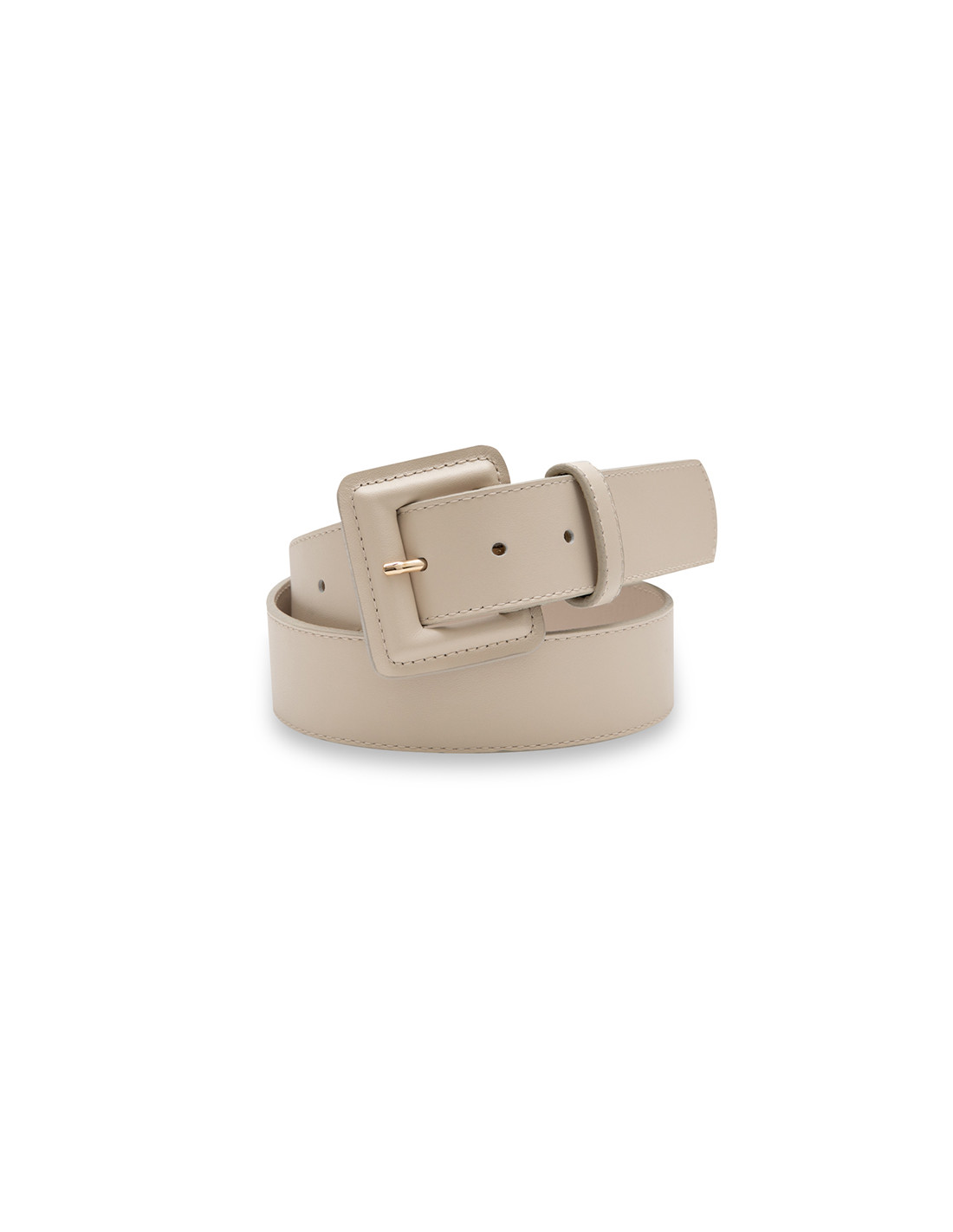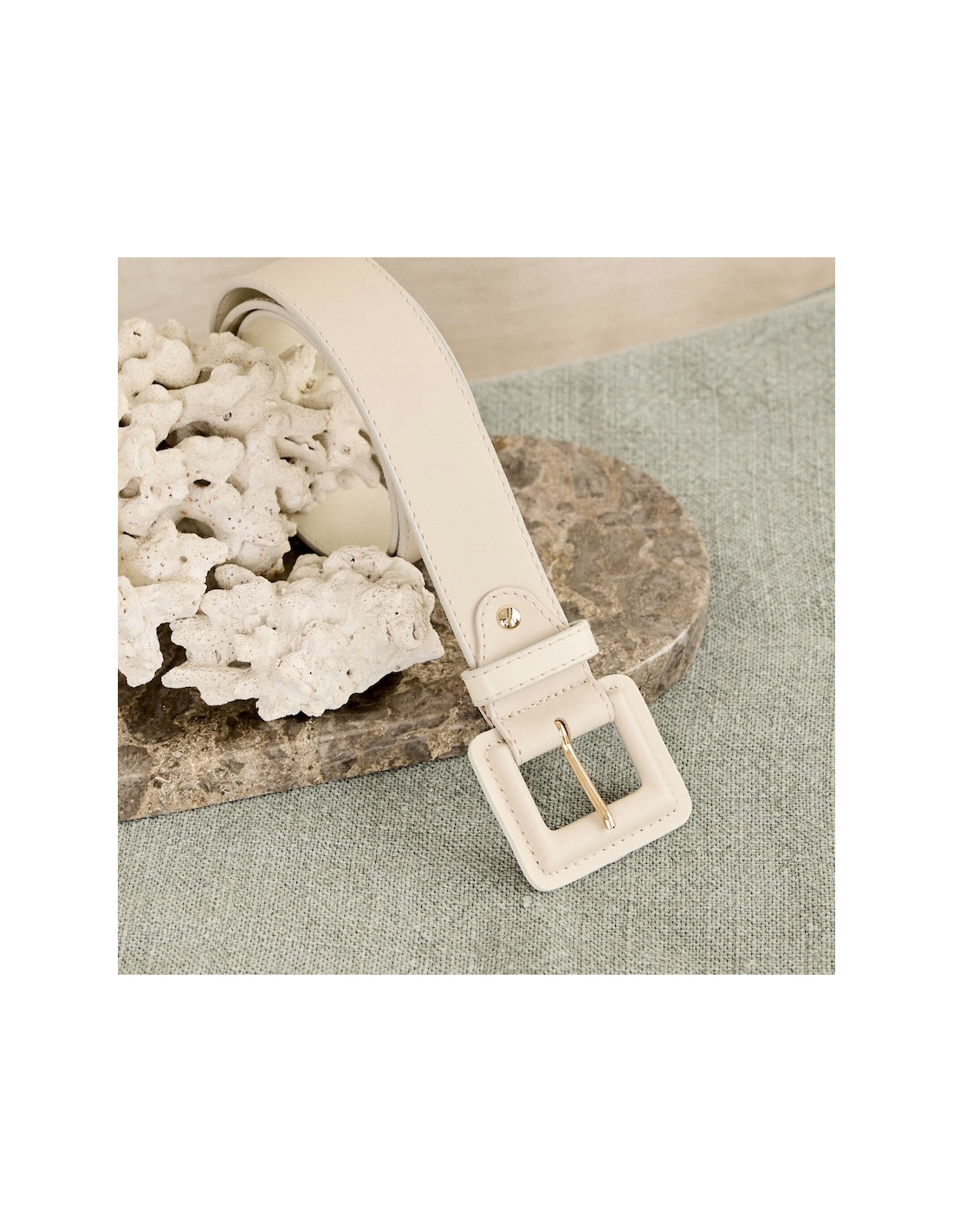 Cinto largo de couro feminino com fivela forrada na cor bege com vista frontal sobre fundo branco - MONPIEL