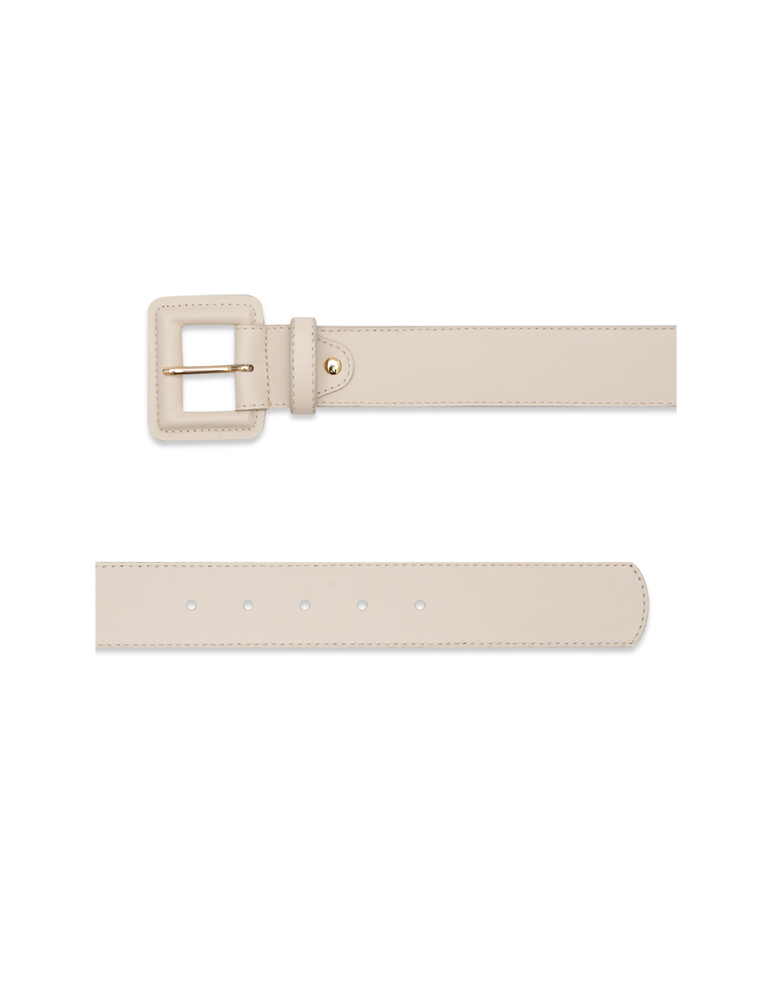 Cinto largo de couro feminino com fivela revestida em bege, close-up detalhando a fivela - MONPIEL