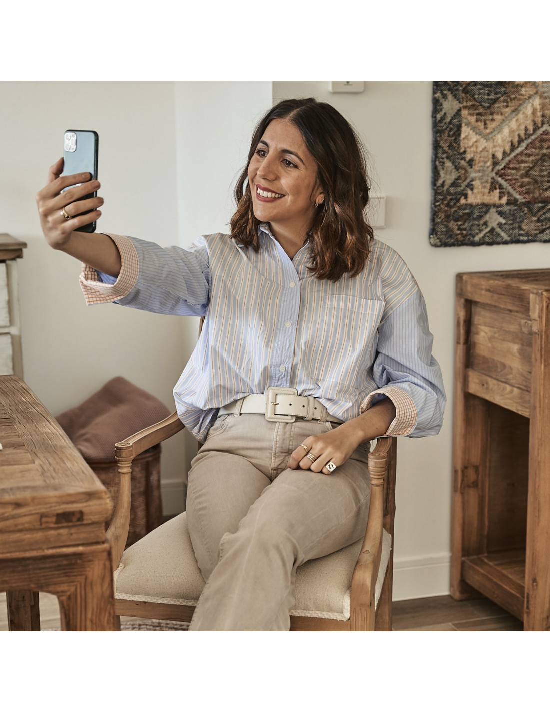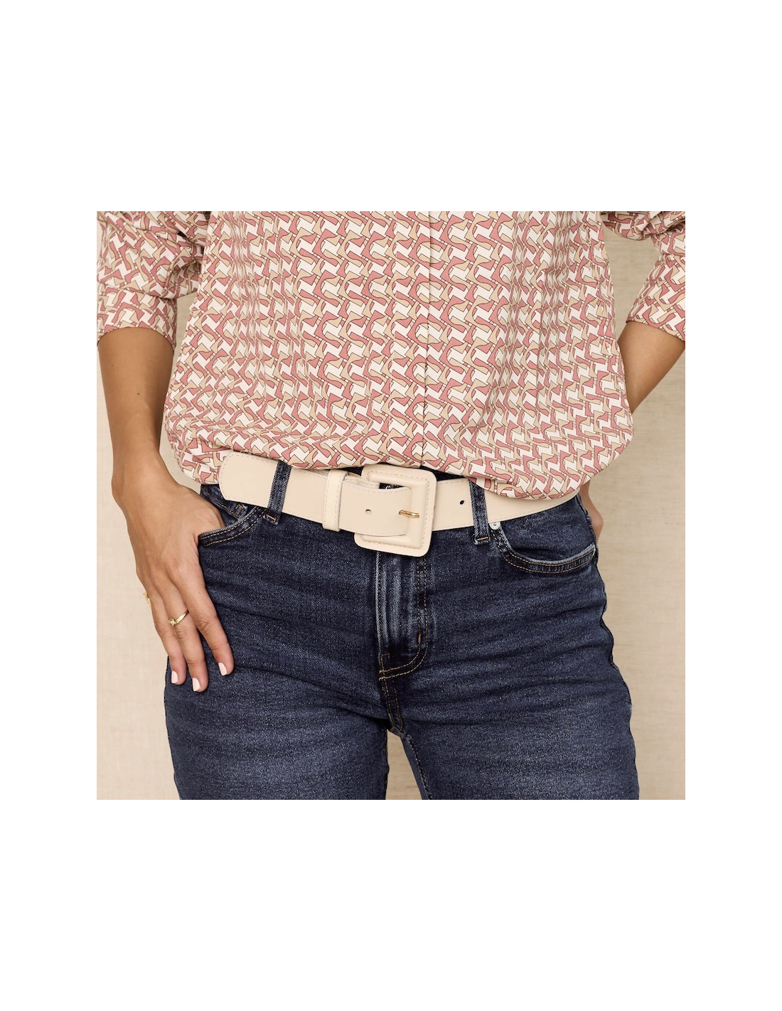 Cinto largo de couro feminino com fivela forrada em bege, usado sobre jeans, com vista frontal - MONPIEL