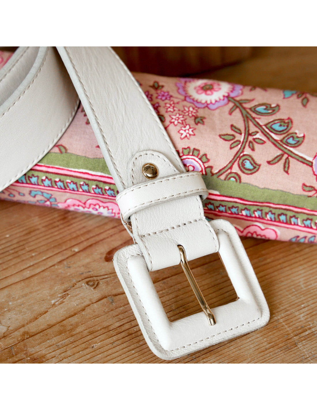 Cinto largo feminino de couro com fivela revestida em bege enrolado sobre um lenço de tecido - MONPIEL