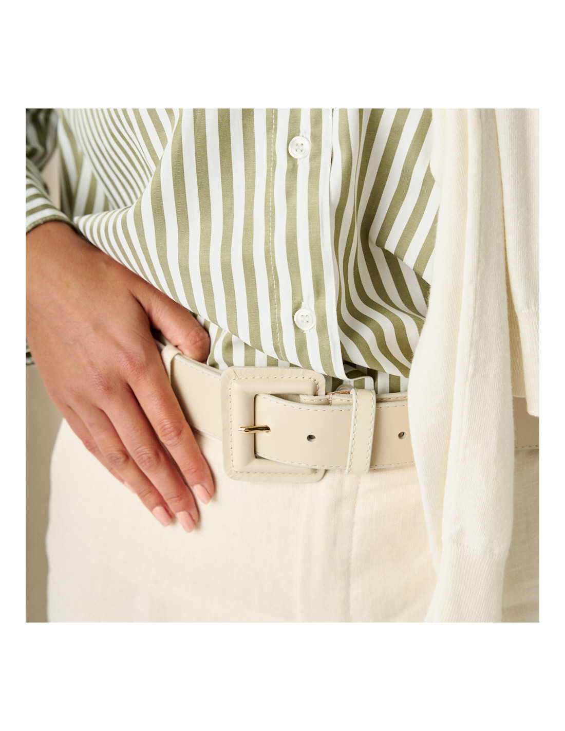 Cinto largo de couro feminino com fivela forrada na cor bege sobre calça com vista geral e frontal - MONPIEL