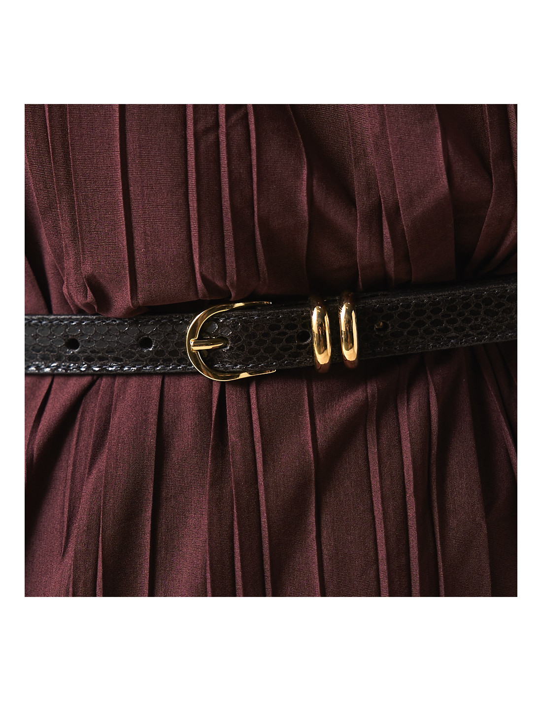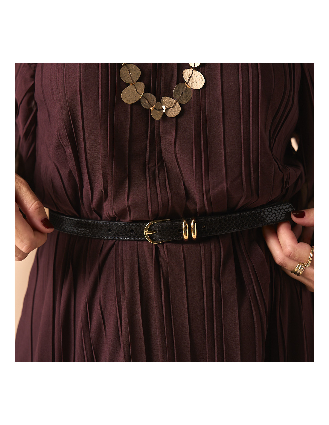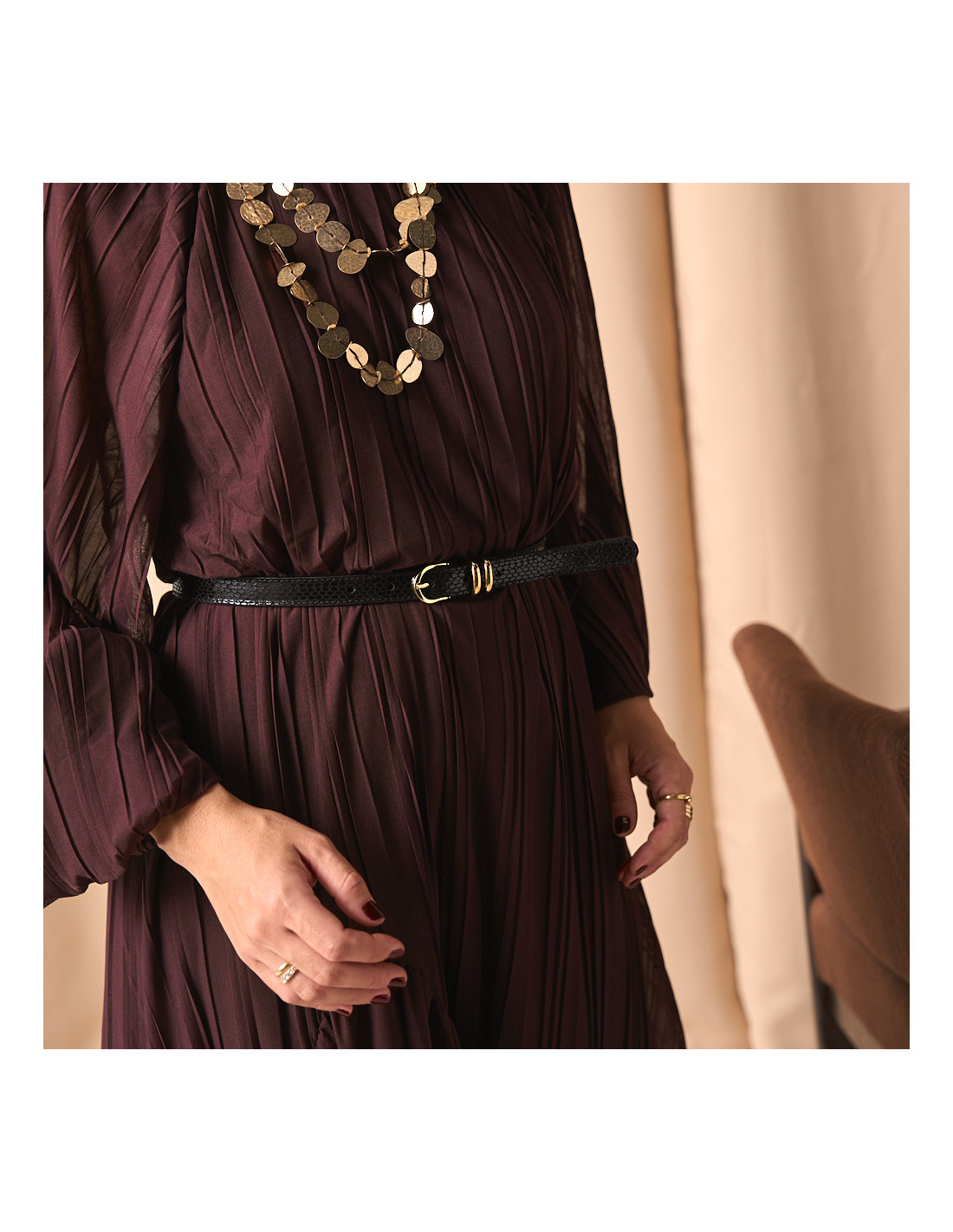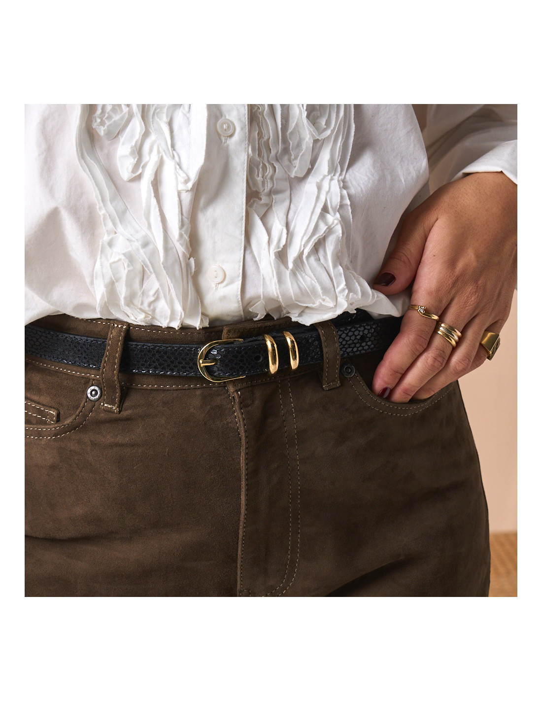 Cinto fino de pele para mulher desenhado para elevar qualquer look — do mais casual ao mais elegante. Com fivela e passadores dourados, este cinto estreito permite inúmeras combinações com o teu guarda-roupa. Escolhe a cor que mais combina contigo — e com o teu estilo.